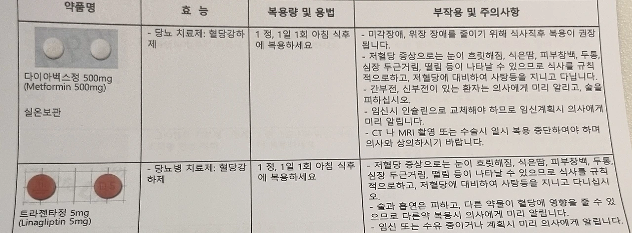 이전과 같이 당뇨약으로 다이아벡스정과 트라젠타정을 1일 1회 아침 식후에 복용하기로 한다.