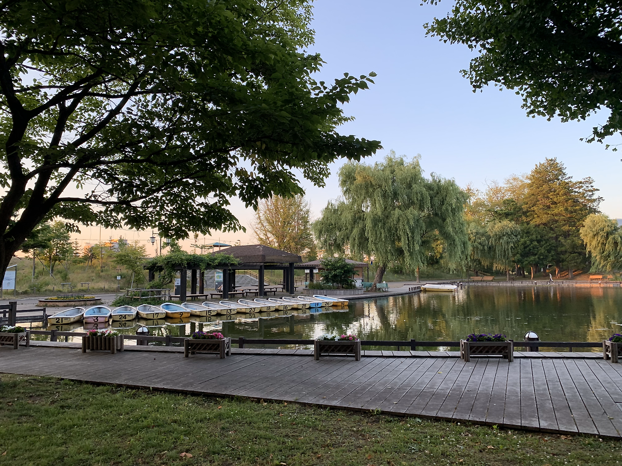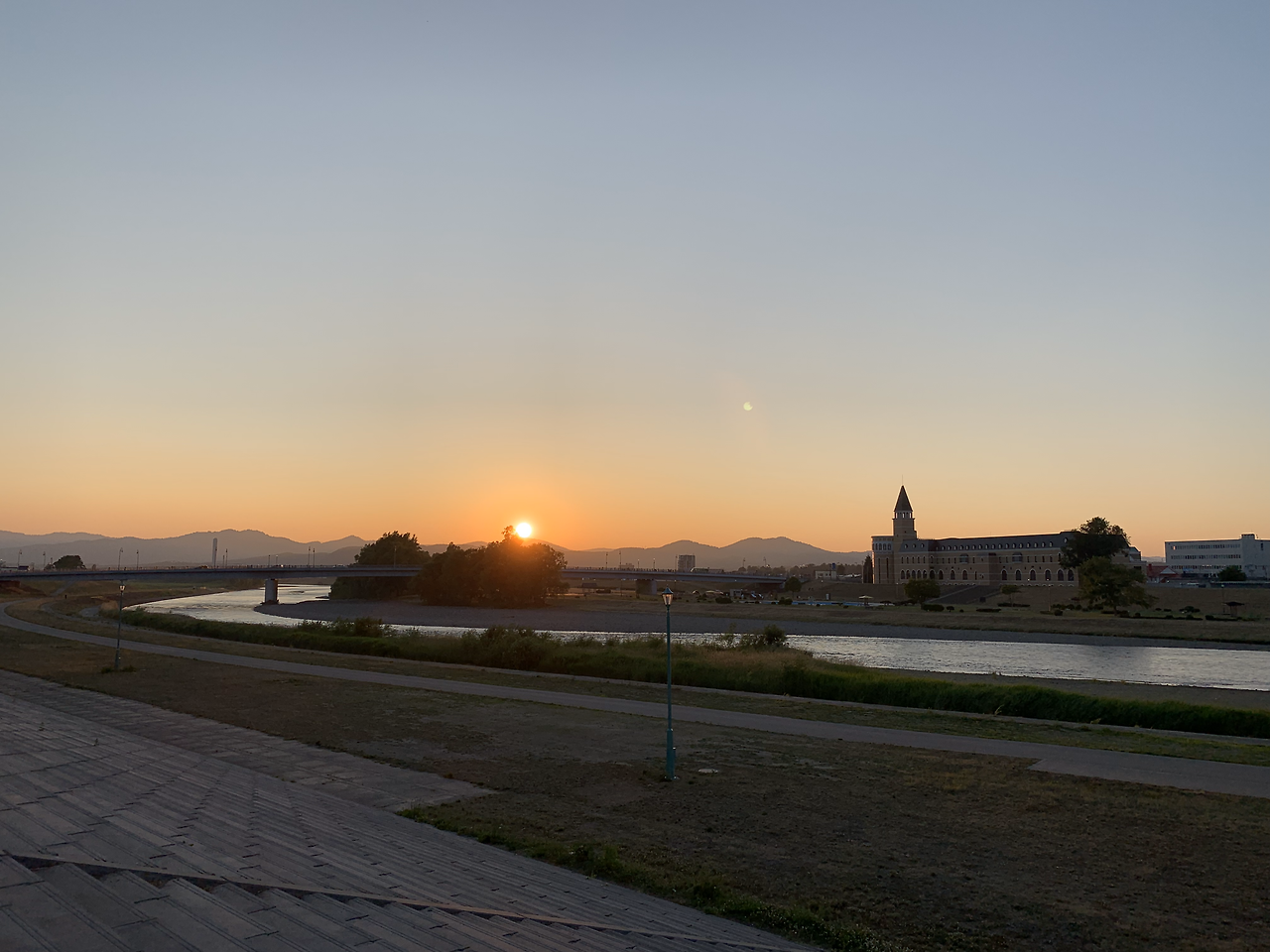 과연 크고 작은 연못과 나룻배, 정자, 큰 나무와 새들이 노니는 고요한 곳이었다. 평일 저녁 먹을 시간이어서 그런지 사람도 별로 없었다. 해가 지고 있었고, 숲은 조금씩 주황빛으로 물들고 있었다. 공원을 계속 걷다 보니 강변이 보였다. 강둑 너머로 노을빛이 비쳤다. 강둑으로 올라가 보기로 했다. 강둑을 오르자 너른 강이 있었고(찾아보니 이시카리 강이라고), 양 옆으로 깔끔하게 정리된 둔치가 있었다. 발갛게 타오르는 해가 지면서 서쪽 하늘을 붉게 물들이고 있었다. 주변에는 자전거를 타는 사람 한 명, 벤치에 자전거를 놓고 앉아서 쉬는 할아버지 한 명이 있을 뿐이었다. 그 고요함, 붉은 노을, 적당한 온기의 공기와 습도, 아내와 손을 잡고 걸었던 산책길에 우연히 볼거리를 마주했다는 기쁨, 낯선 곳에서 느껴지는 기분 좋은 긴장감, 그 긴장감을 한결 씻겨주는 한가한 공원의 풍경. 그것들이 문득 떠올랐다.