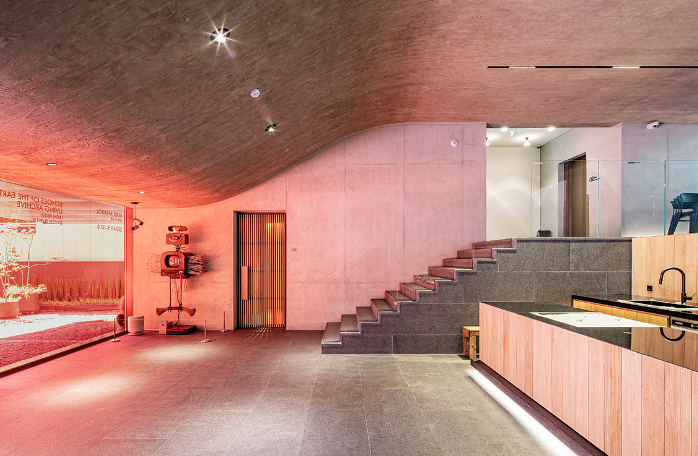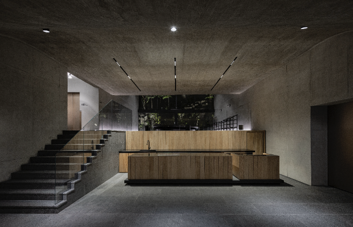 계단 난간에 다가가면 이 빛의 경로를 따라 위에서 아래로 떨어지는 작품의 전체 광경을 감상할 수 있다.