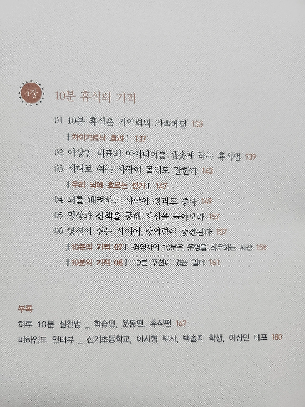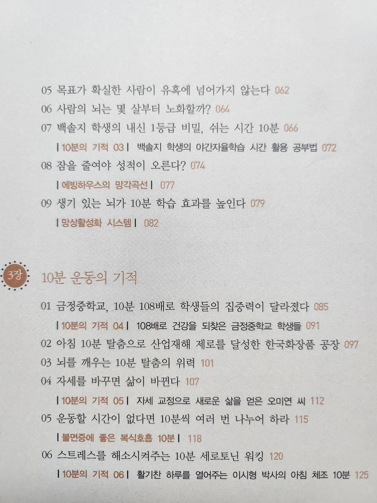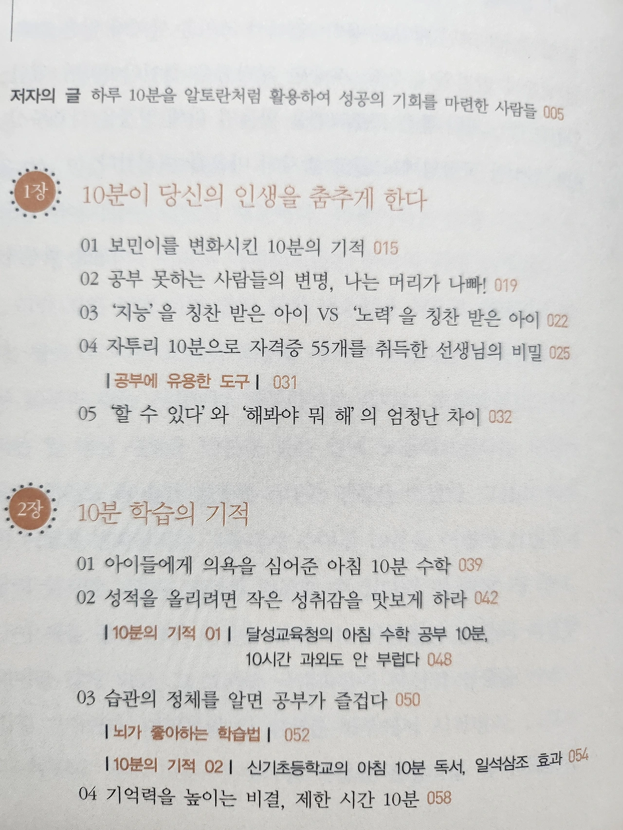 자투리 시간으로 여기던 10분을 하루 10분 공부, 하루 10분 운동, 하루 10분 명상과 휴식을 집중적으로 하면 삶이 달라질 수 있다고 한다. 우리 아이에게 하루 10분 일찍 일어나서 영어 단어를 좀 외우자고 했다. 그랬더니 점점 등교시간이 10분씩 빨라지고 말았다. 공부가 싫어 학교를 빨리 가는 선택을 하다니 어이가 없었지만 본인이 하려고 하는 의지가 제일 중요한 것 같다. 아이가 하루에 그냥 낭비하는 10분씩을 모으면 많은 시간이 된다는 것과 그 시간에 집중력을 발휘하면 할 수 있는 일이 많아진다는 것을 알게 되면 좋겠다.
