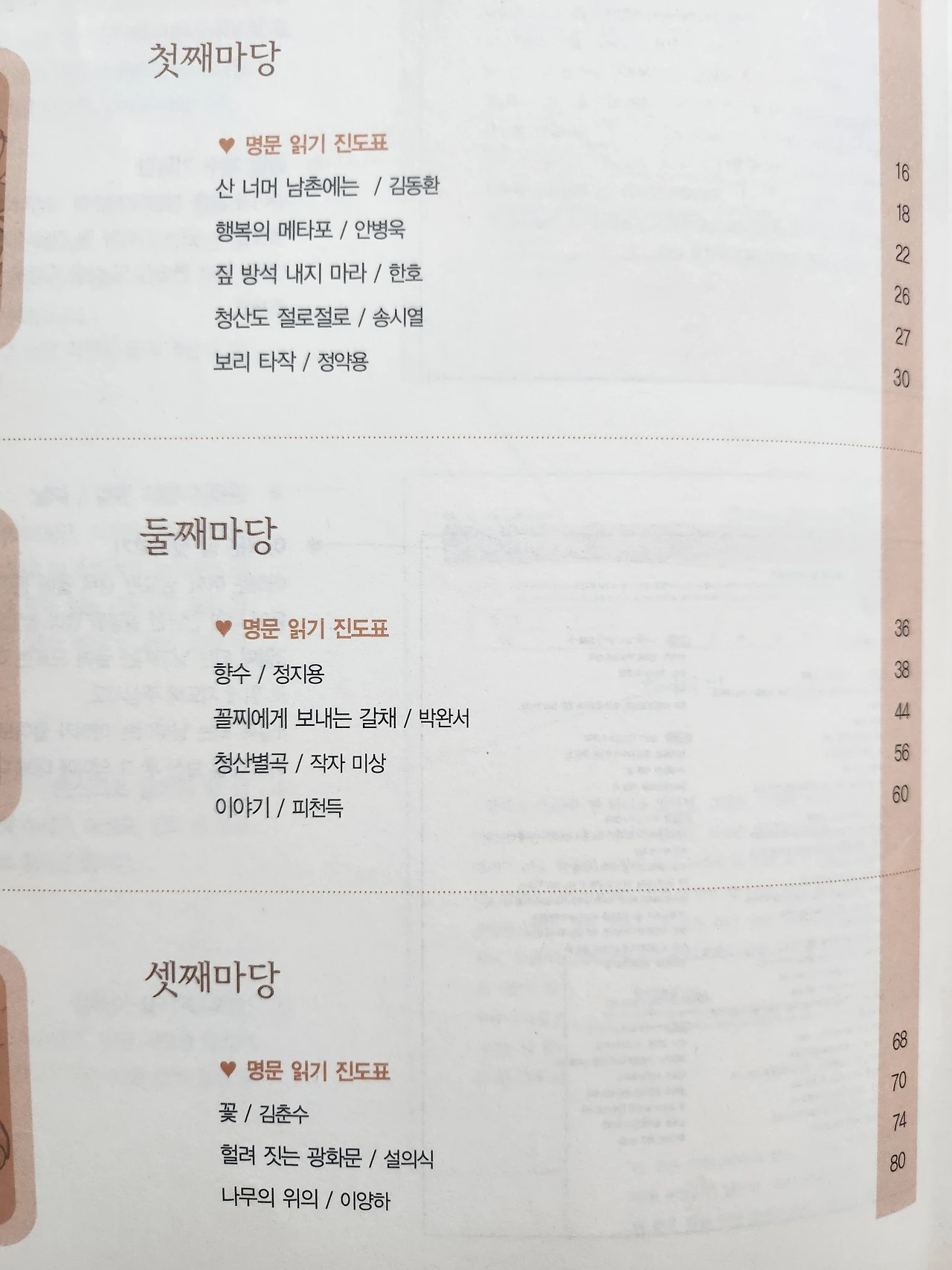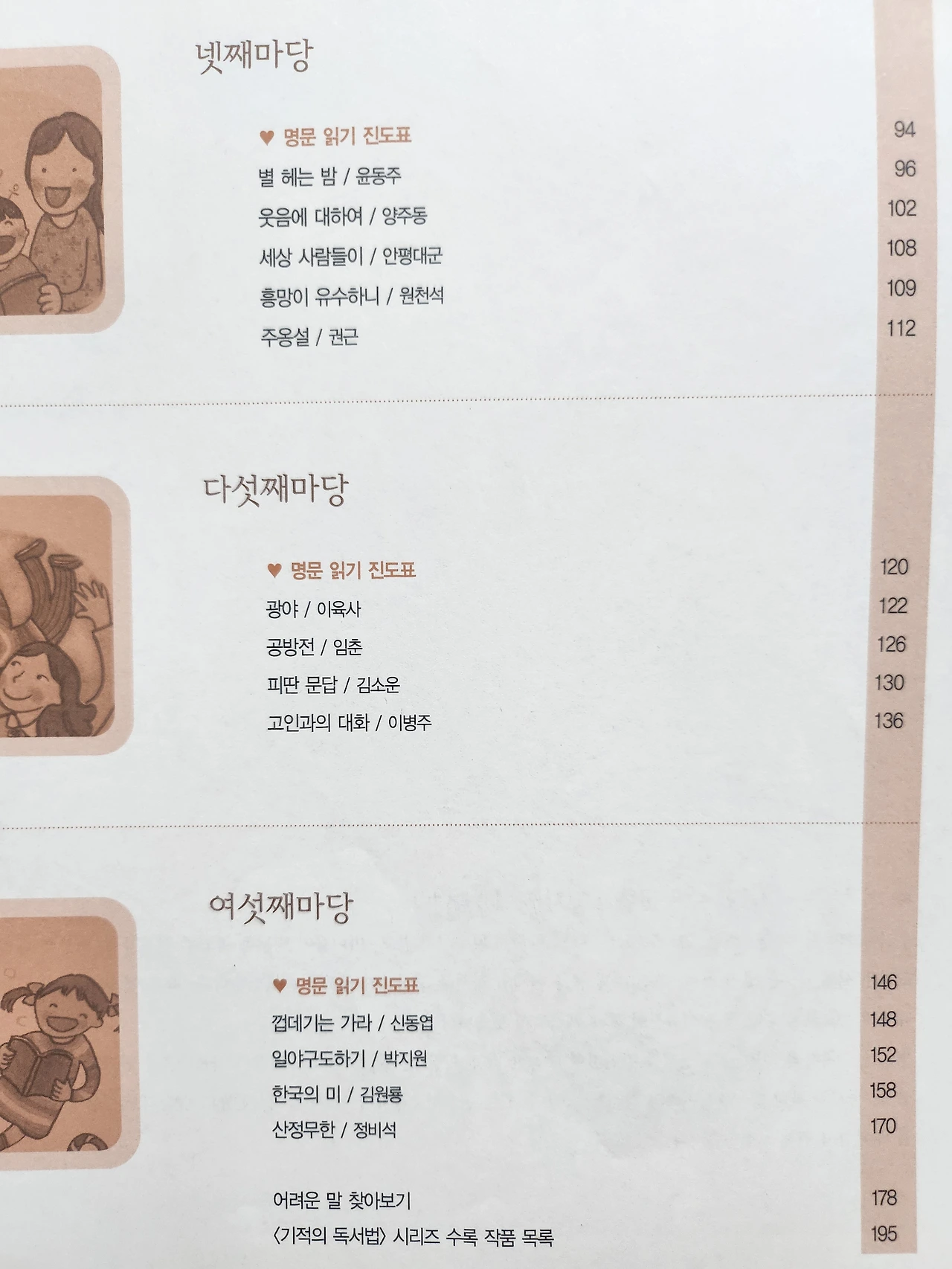 읽는 시간을 기록하는 것도 있는데 아직 시간을 재는 것은 무리인 것 같다. 수록작품은 중학생 과정에도 나오는 것들이고 유명 고전의 명문들도 있다. 글을 한번 읽고 다음 장에는 그 문장 중 몇 단어에 빈칸이 있어 채워 넣기를 해야 한다. 어휘력 공부도 같이 할 수 있다. 집중력이 약한 남자아이들에게 이 책을 하루에 조금씩이라도 소리를 내어서 읽어보라고 했다. 평소 말소리가 작았던 첫째 아이의 목소리가 조금 커지기를, 독서라면 책장을 넘기기만 하면 되는 줄 아는 둘째 아이가 글을 조금이나마 읽기를 바라는 마음에서이다.