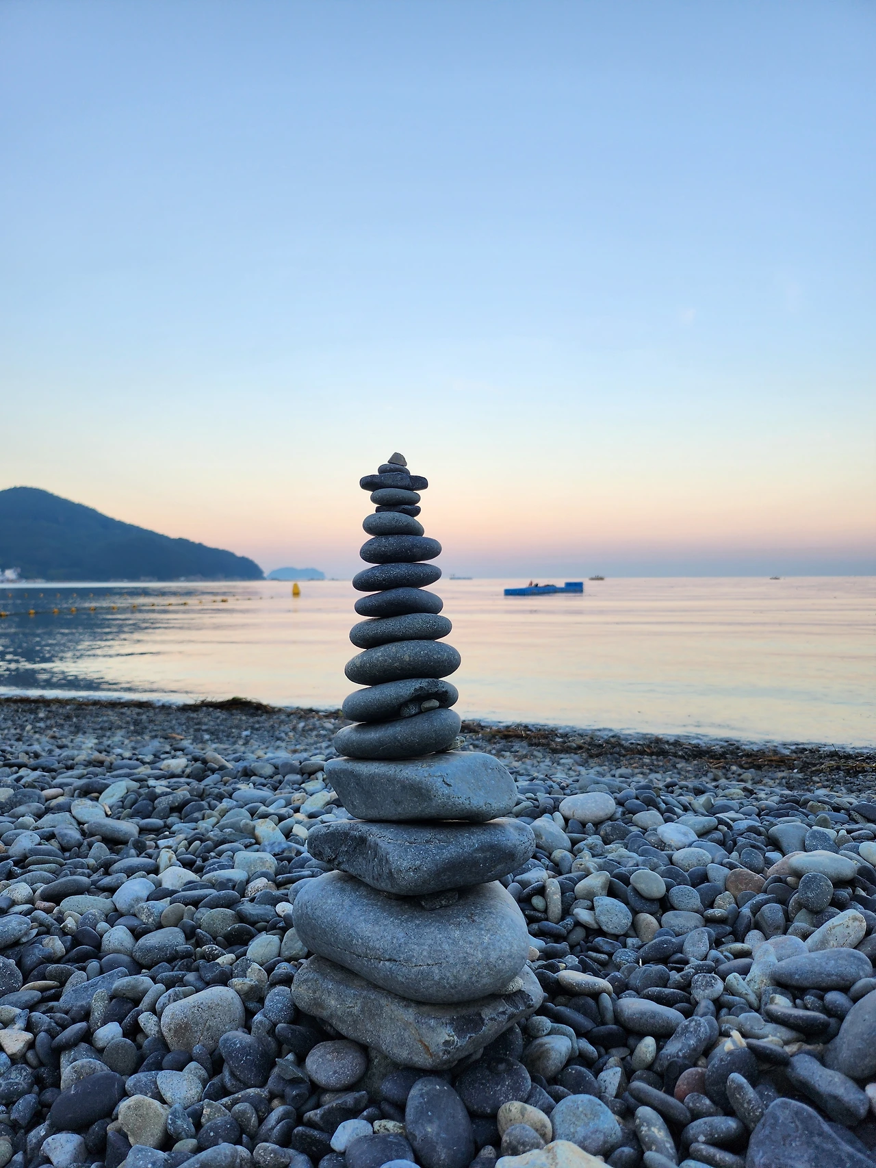 어떤 이가 쌓아놓은 돌탑을 발견했다. 어떤 염원을 빌었기에 이렇게 많이 쌓았을 수가 있었나 싶었다. 우리도 따라 해 본다고 옆에 각자 나름의 돌탑을 쌓아봤는데 서툴러서 돌멩이 7개도 쌓기가 어려웠다. 우리도 시간이 좀 많았다면 정성스럽게 쌓을 수 있었을까? 돌 크기와 모양대로 그냥 하나씩 쌓은 듯싶었지만 자세히 보니 균형을 맞추기 위해 아주 작은 돌을 사이에 끼워놓은 것을 발견했다. 어머니께서 이분은 한두 번 쌓아본 솜씨가 아니라고 하셨다. 이분을 이길 수 없을 것 같아서 우리는 그냥 작은 탑에 만족을 하고 또 그것에다 소원을 빌었다. 환상적인 노을과 몽돌이 파도에 밀려 달그락 소리도 나고 물이 빠져나가는 소리도 나서 눈과 귀가 아주 호강한 하루였다.