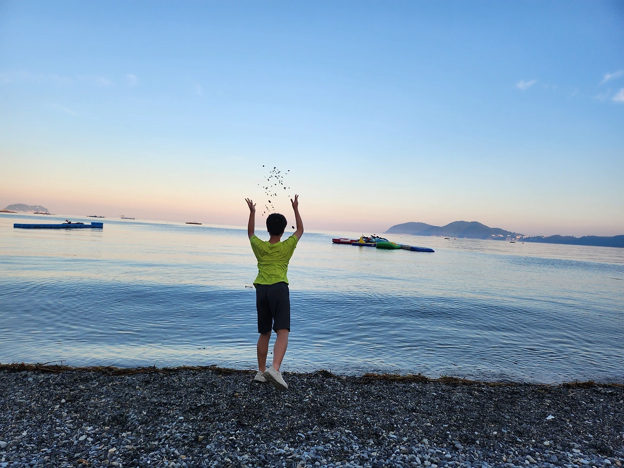 이번 여행 계획 중 유일한 해수욕장인 학동 몽돌 해수욕장에 왔다. 거제도에서 남쪽 부근이라 빨간 노을을 보기는 힘들었으나 오묘한 빛을 내며 해가 지고 있었다. 낮에 살갗이 익어가는 해수욕은 도저히 자신이 없었다. 원래 계획대로라면 구명조끼를 착용하고 바다에 들어가 신나게 노는 것이었는데, 황토가 많이 보이고 나뭇가지가 많이 떠내려온 바다를 보니 발도 담그고 싶지 않았다. 그래도 어머니께서 여기까지 왔는데 하시면서 바다에 발목까지는 들어갔다 나오시고 아이들도 발목까지는 바닷물에 담그고 나왔다. 하지만 우리 아이들은 해수욕장에 가면 물놀이를 하는 것보다 돌을 던지며 노는 것을 더 좋아한다. 포항의 모래가 많은 바다에 작은 돌을 던지다가 여기에 둥글고 큰 돌을 보니 신이 났는지 마구 던져댔다. 평일 저녁이라 사람들이 많이 없어서 다행이었다. 주변에 사람들이 많이 있으면 돌을 못 던지게 했을 것이다. 첫째 아이는 돌로 물 수제비도 제법 던졌다. 둘째 아이는 어디서 그런 큰 돌을 찾아왔는지 땀을 뻘뻘 흘리면서도 돌을 던지고 놀았다. 나는 둥근돌을 지압판 삼아 양말만 신은 채로 주위를 돌아다녔다. 뾰족한 지압판보다는 덜 아프고 시원한 느낌이었다.