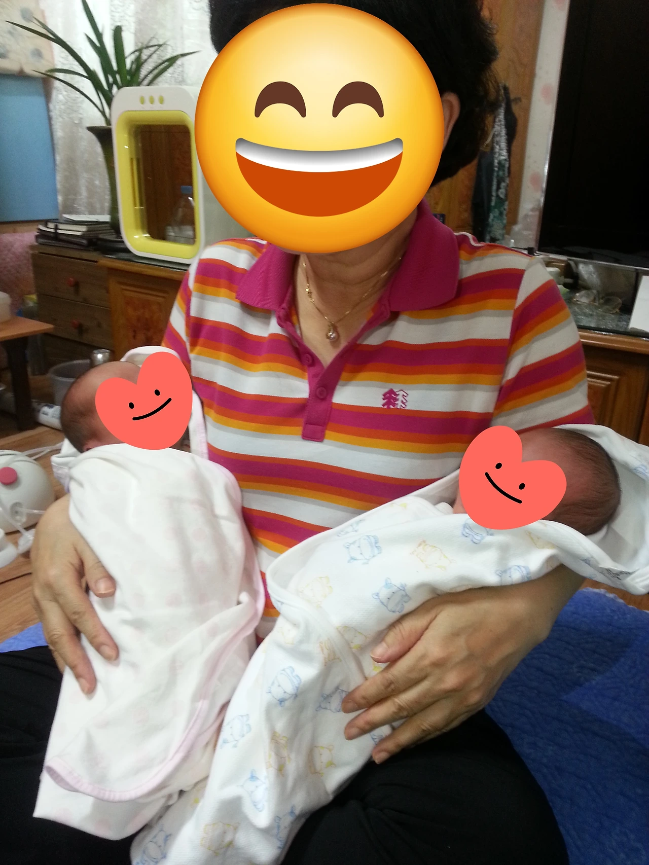 살이 조금 더 오르고 나의 아기 때 얼굴과 똑같은 콩콩이의 얼굴이 볼 때마다 신기하였다. 마음껏 이뻐해 주고 싶었지만 아직 병원에 있는 용용이에게 미안한 마음에 그렇게 하지도 못했다. 그리고 얼마 되지 않는 모유를 더 적은 몸무게로 태어난 용용이에게 몰아주었었다. 콩콩이는 나의 모유를 거의 먹지 못했다. 그런 면에서는 또 콩콩이에게 미안했다. 쌍둥이 엄마들은 어떻게 사랑을 나누어 주는 거지? 한 아이에게 잘해주면 다른 아이에게 미안함이 따라온다. 무엇이든 정확하게 나누어 줄 수가 없을 것 같은 상황이 계속될 것만 같았다. 우리 아이들은 크면서 부모님에게 온전한 사랑을 못 받은 것에 속상해하겠지 하는 생각을 하였다. 그리고 며칠 후 용용이도 퇴원해서 집으로 데리고 왔다. 두 아이를 동시에 안고 사진을 찍었다. 이제 정말 둘 다 내 품에 왔구나 하며 안심이 되었다. 부모님은 작게 낳아 크게 키우면 된다고 한 번 더 나에게 힘을 주셨고 난 그저 아이들이 건강하게만 자랐으면 좋겠다는 생각뿐이었다. 확실히 적은 양이라도 모유를 먹은 용용이는 잔병이 걸리지 않았다. 같이 있어도 콩콩이만 감기가 걸릴 때마다 미안한 맘에 조금 더 관심을 주었다. 비록 사랑을 줄 때 상황에 따라 비율 조절을 하는 이상한 엄마이지만 둘 다 사랑을 많이 받았다고 느낄 만큼 충분히 주어야겠다고 다짐했다. 너희를 낳은 것이 내가 세상에 태어나 가장 의미 있고 잘한 일이라고 말해주고 싶다. 나한테는 세상 무엇과도 바꿀 수 없는 소중한 보물들이라고.