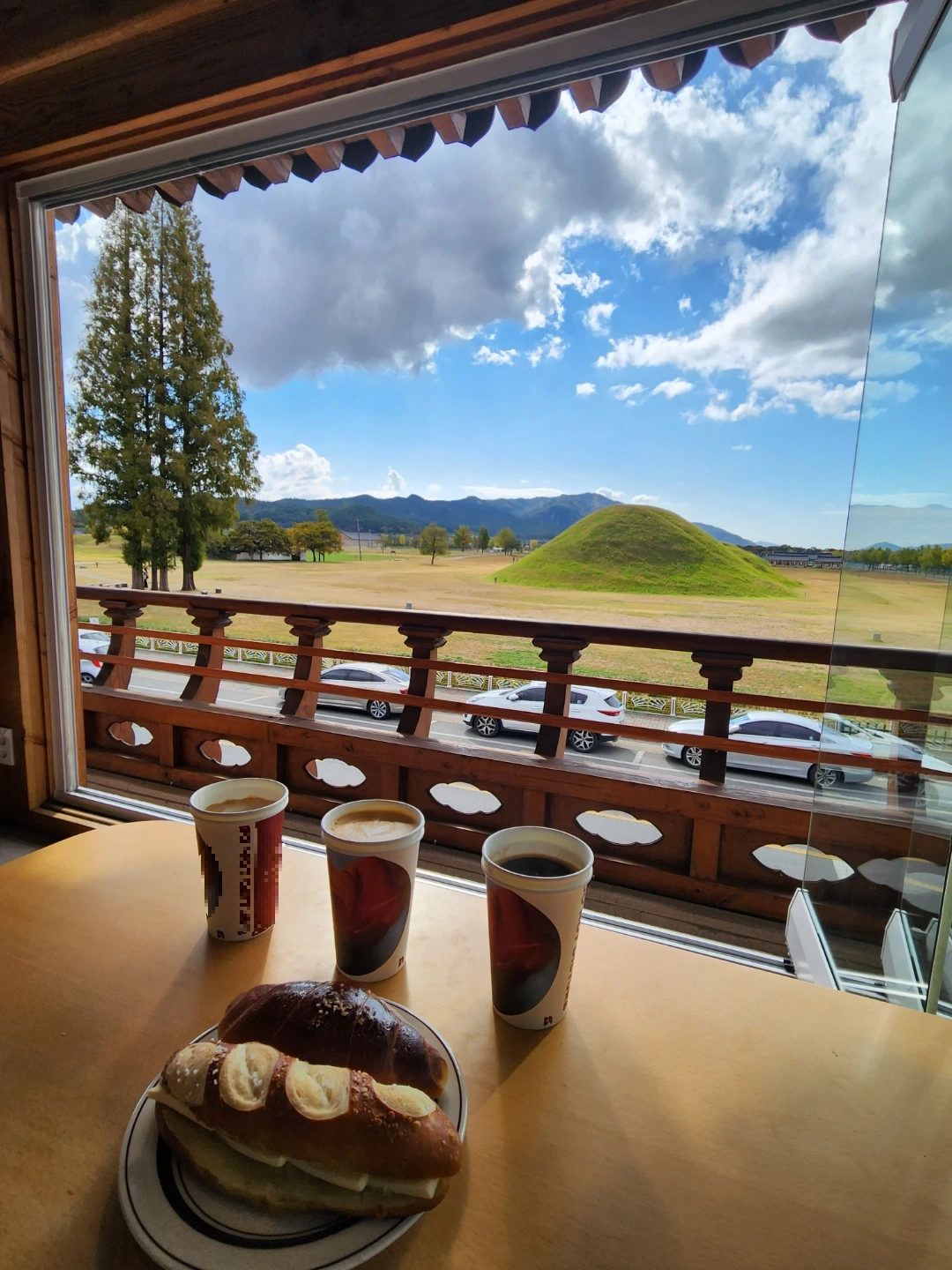 그리고 이렇게 카페에서 바라보는 풍경은 정말 개성이 있고 독특하다. 이 풍경의 값어치는 대체 얼마로 해야 할까? 과거 신라로부터 천년이 넘는 세월을 거슬러 이곳 경주로 내 마음이 달려오고 있다. 누구의 무덤인지도 모르지만 이런 그림과 같은 풍경은 다른 나라에서는 쉽게 볼 수 없을 것이다. 이집트의 더 웅장한 피라미드가 있다고 해도 경주처럼 이렇게 가까이에 있는 카페에서 커피를 마시며 휴식을 취하면서 볼 수 있을까 하는 생각이 든다.
