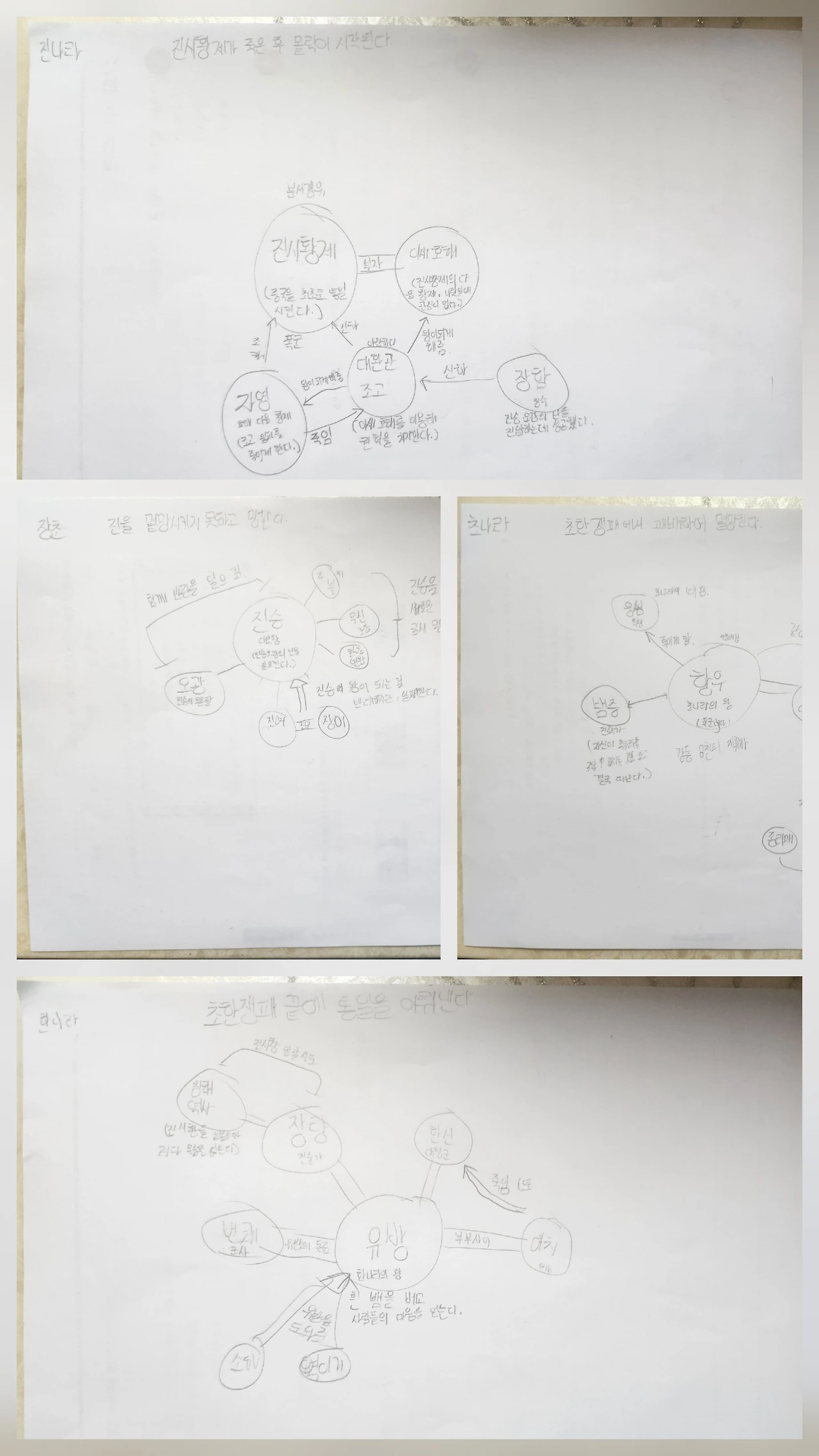 초한지는 중국의 진시황제가 다스리던 진나라가 멸망하고 유방이 초나라와 싸워 이기고 한나라를 세우는 과정이 나오는 소설이다. 아이에게 인물도를 보고 초한지의 내용을 간단히 설명해 보라고 했더니 그냥 막연하게 줄거리를 적으라고 했을 때보다는 쉽게 하는 것 같았다.