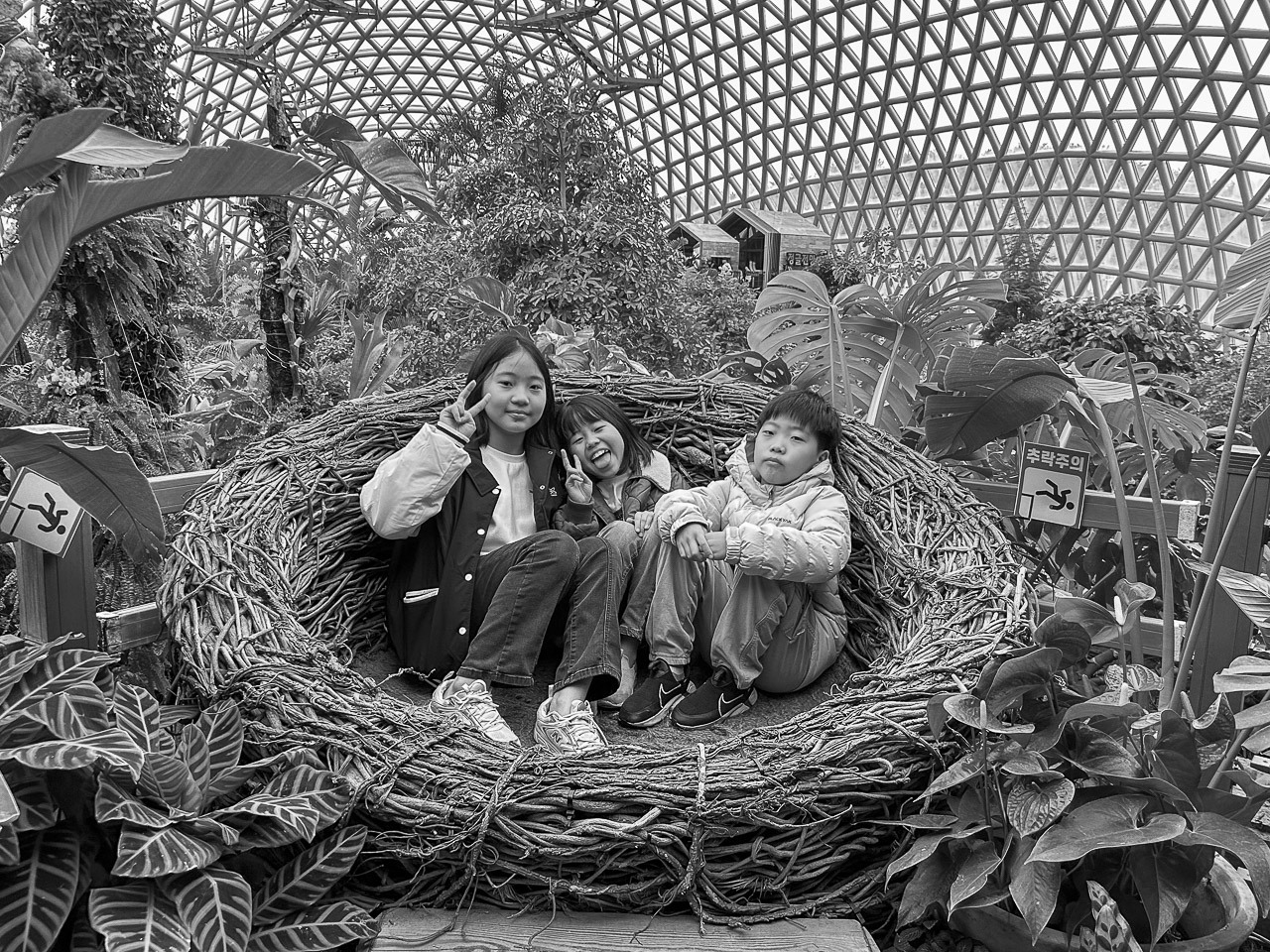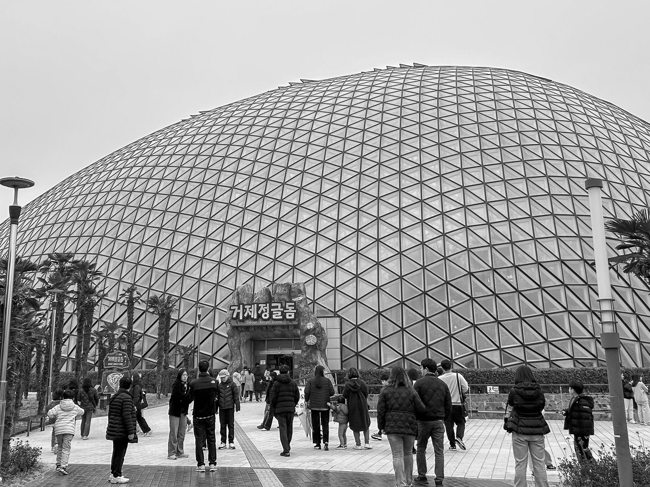 숲소리 공원에서의 산책과 점심을 마치고 나올 때까지도 빗줄기가 굵게 내렸다. 오후에는 실외 관광이 어렵겠다 판단하고, GPT가 추천했던 실내 관광지 중 하나인 거제 식물원으로 향했다. 이곳에는 전시 공간도 많았지만, 무엇보다 거대한 유리 돔 형태의 실내 식물원, ‘거제 정글돔’ 이 유명하다고 했다. 비가 오는 날, 아이들과 산책 대신 새로운 공간에서 시간을 보내기에 충분히 매력적인 장소였다.