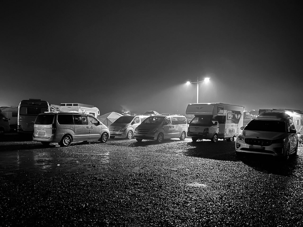 캠핑카와 카라반, 음악, 춤, 웃음소리. 마치 야외 클럽 같은 열기. 우리는 조용히 한 자리를 찾아 정박하고, 고현시장에서 사 온 음식들로 따뜻한 저녁을 먹으며 하루를 마무리했다.