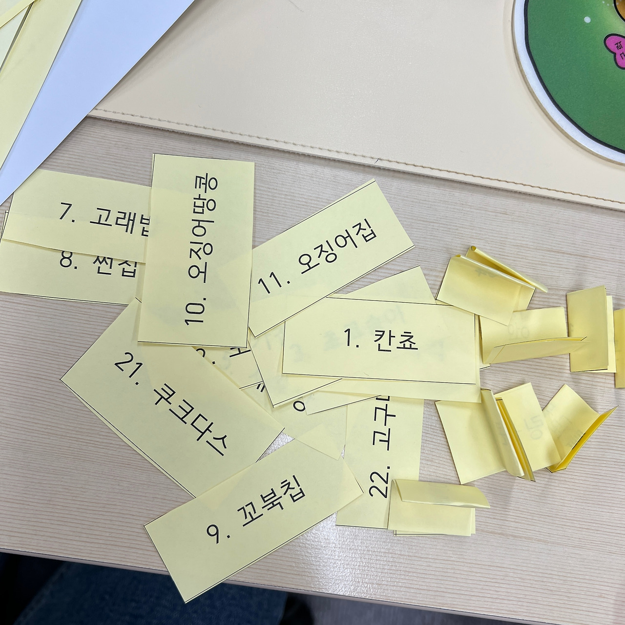 머리를 짜내 22개의 과자 이름을 생각해 내 뽑기와 자리배치도를 만들었다.