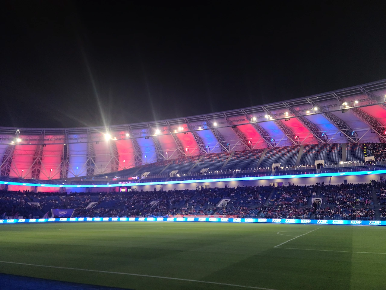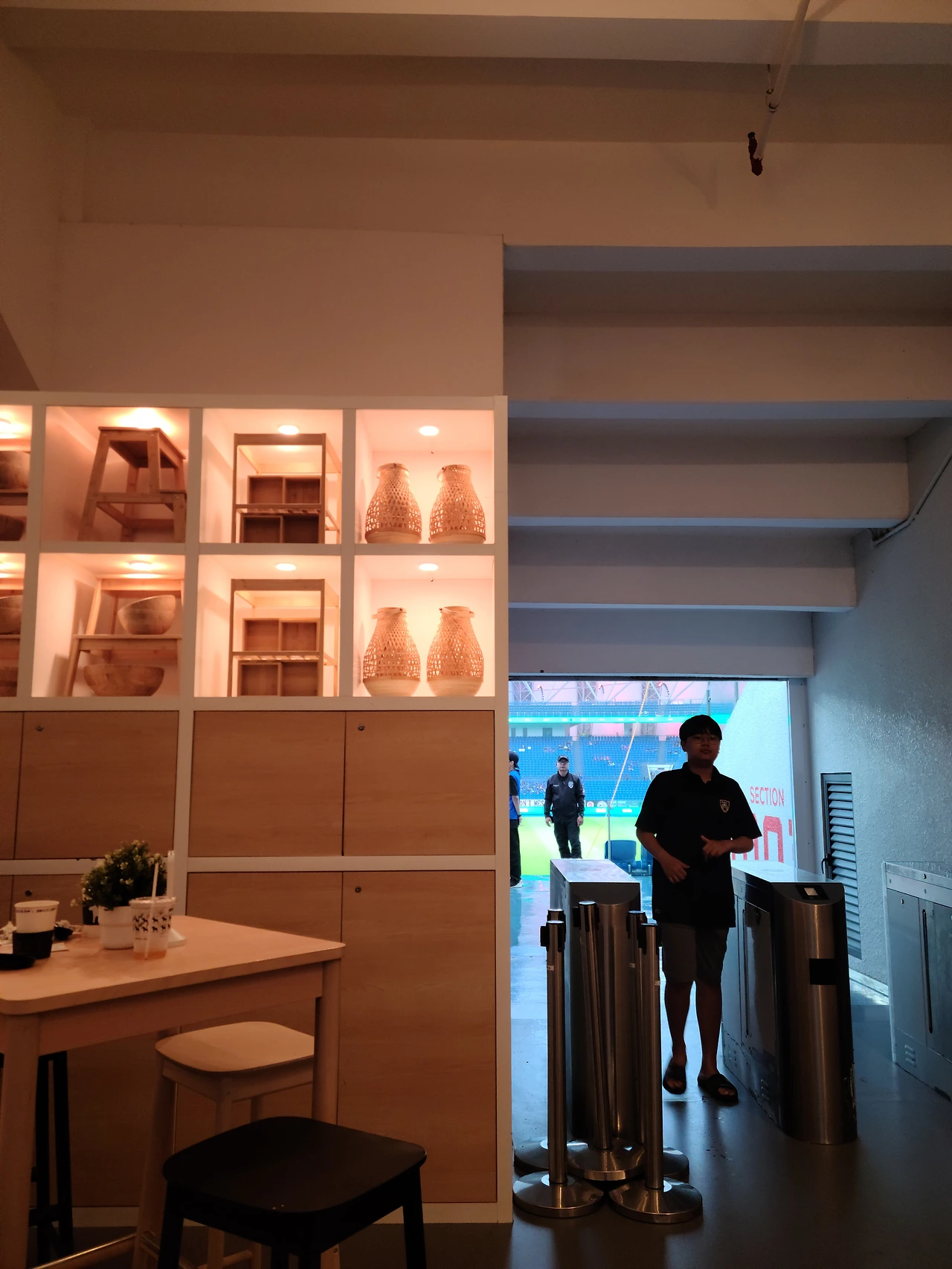 하지만 간과한 것은 여기는 심심한 이슬람 국가라는 것이었다. 구글에서 검색해본 것과 달리 너무 작고 별 볼일 없던 아이스링크, 엄청난 스테이크를 판매하는 것처럼 보였던 샌드위치 가게 수준의 레스토랑, 한국과 달리 푸드트럭도 외부에 없고 비는 주룩주룩 내리고... 8시까지의 시간이 꽤나 걸릴 것만 같다. 다행히 우리는 일찍 도착한 덕에 빨리 티켓팅을 하고 주경기장 안에 들어왔고, 그 안에는 IKEA 팝업 스토어와 IKEA cafe가 있었다. 어차피 아이와 배를 채워야 하니 IKEA cafe에 자리를 잡았다. 신기한 것은 IKEA cafe 한쪽문은 경기장 응원석과 바로 이어져 있어서 경기장 분위기를 바로 볼 수 있다는 점이었다. 가드들이 몇 명 있었지만 너무 시간이 일러서인지 경기장 안을 구경하는 걸 따로 제지하지는 않았다. 아이와 함께 경기장에 살짝 들어가보니 비가 그칠 기미가 안 보인다. 비닐 비옷을 입고 지나가는 열성팬에게 물어보니 'outside에서 샀다.'고 하는데... 한국에서처럼 발빠른 비옷장수도 바깥엔 안 보인다. 반쯤 체념한 상태에서 IKEA 카페 직원에게 커피와 빵을 주문하면서, 비옷이 없어 걱정이다라고 했더니, 씩씩한 직원이 큰 목소리로 "Go to IKEA pop-up store."라며 손으로 가리킨다. 조잡한 수준의 비닐 비옷이 아니라, 등산, 캠핑에서 꽤 오래 사용할 수 있을 거 같은 제대로 된 비옷이다. 만원 정도의 가격이었는데, '이 곳은 우기이며 내일은 싱가포르 유니버셜 스튜디오를 갈 건데, 비가 오지 않더라도 쥬라기 머시기를 비옷없이 타면 다 젖는다고 하더라.' 라며 스스로를 설득했고 아이와 나는 검은색 비옷을 멋드러지게 입고 경기장에 들어갔다.