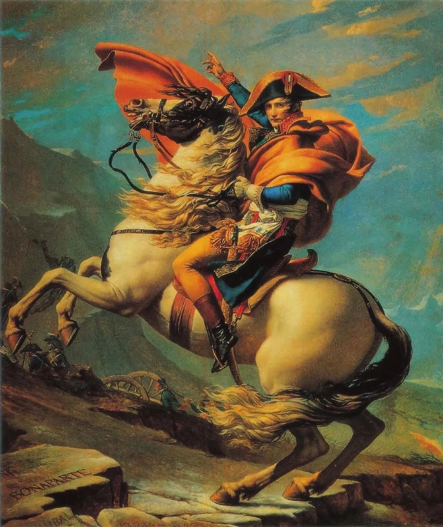 하지만 사실 이 그림은 100% 조작된 장면입니다. 나폴레옹은 빨간 망토를 한 적도, 백마를 탄 적도 없답니다.