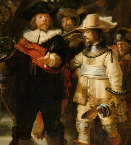 그림 속에는 돈을 한 푼도 내지 않고 당당히 얼굴을 내민 불청객이 숨어 있습니다. 깃발을 든 대원의 어깨 뒤편, 베레모를 쓰고 한쪽 눈만 빼꼼히 내민 남자가 보이시나요? 바로 렘브란트 자신입니다.