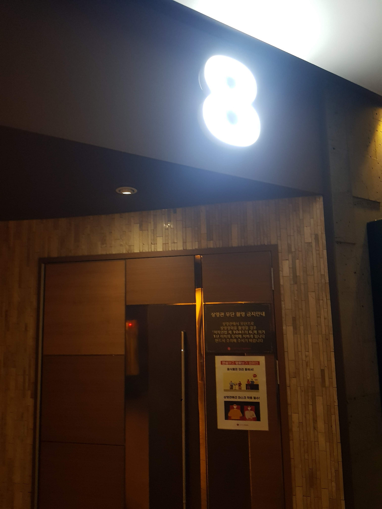 엘리베이터를 타고 8관에 도달했습니다. 하지만 누구도 없었습니다. 작년 같았으면 사람들은 물론이고 항상 직원이 매와 같은 눈으로 입구에 서 있었습니다. 하지만 누구도 표를 검사할 사람이 없었습니다. 결국 스스로 표를 확인하고 영화관 문을 열어 들어갔습니다. 들어가면서 죄인 된 느낌으로 고개를 숙이고 들어갔습니다. 이미 영화는 시작했고 제가 들어갈 좌석을 찾기 위해 관객석으로 고개를 돌리는 순간...