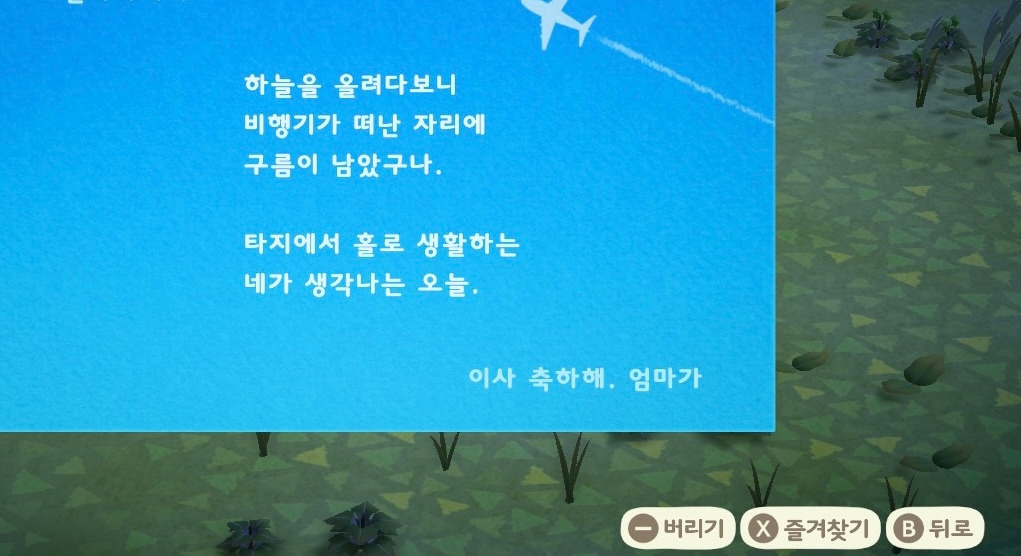 동물의 숲에는 편지함이 있다. 동물 친구들이나 그 외 게임하면서 만나는 캐릭터들이 주인공에게 편지와 선물을 보낸다. 프로그램을 잘 만들어서 그런지 매번 내용도 새롭고 관계의 변화에 따라 말투도 변한다. 그 와중에 항상 어머니를 멈칫하게 하는 편지가 있다. 바로 <엄마>가 보낸 편지다.