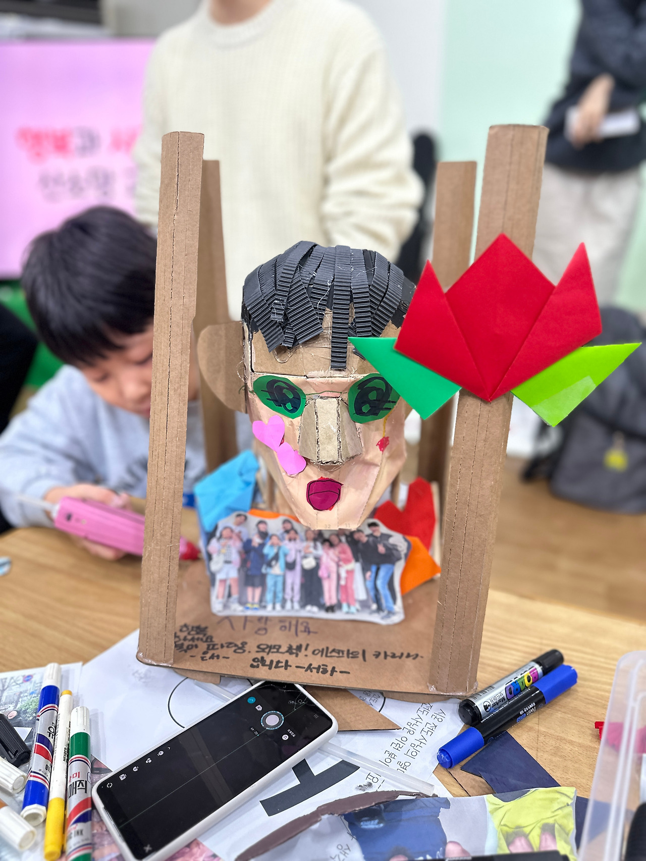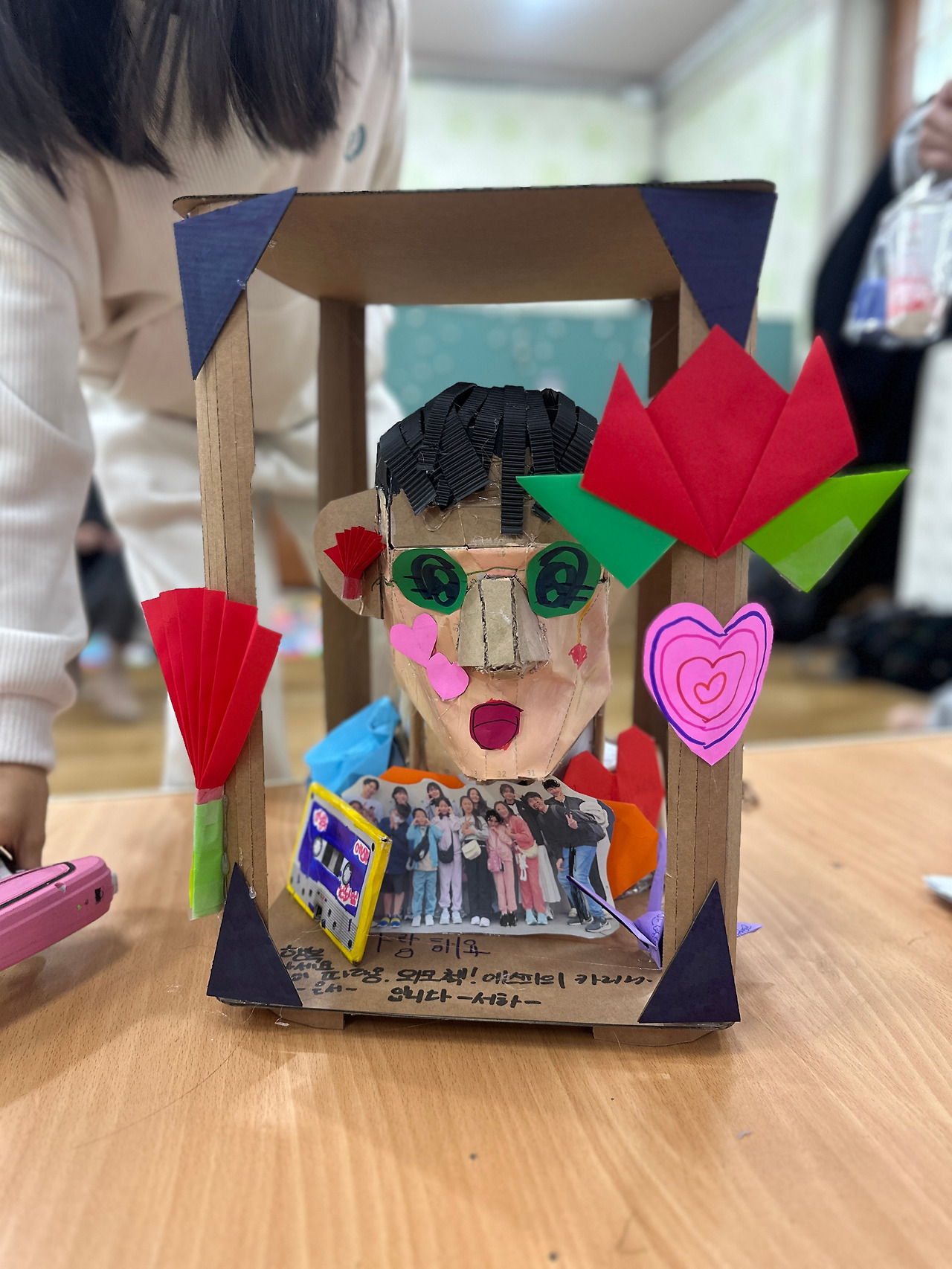 • 다른 아이들은 색종이로 꽃이나 편지를 접어서, 두상 여기저기에 붙였고, 어떤 아이는 종이비행기를 만들어 “전도사님께 날아간다”는 식으로 장식했습니다.