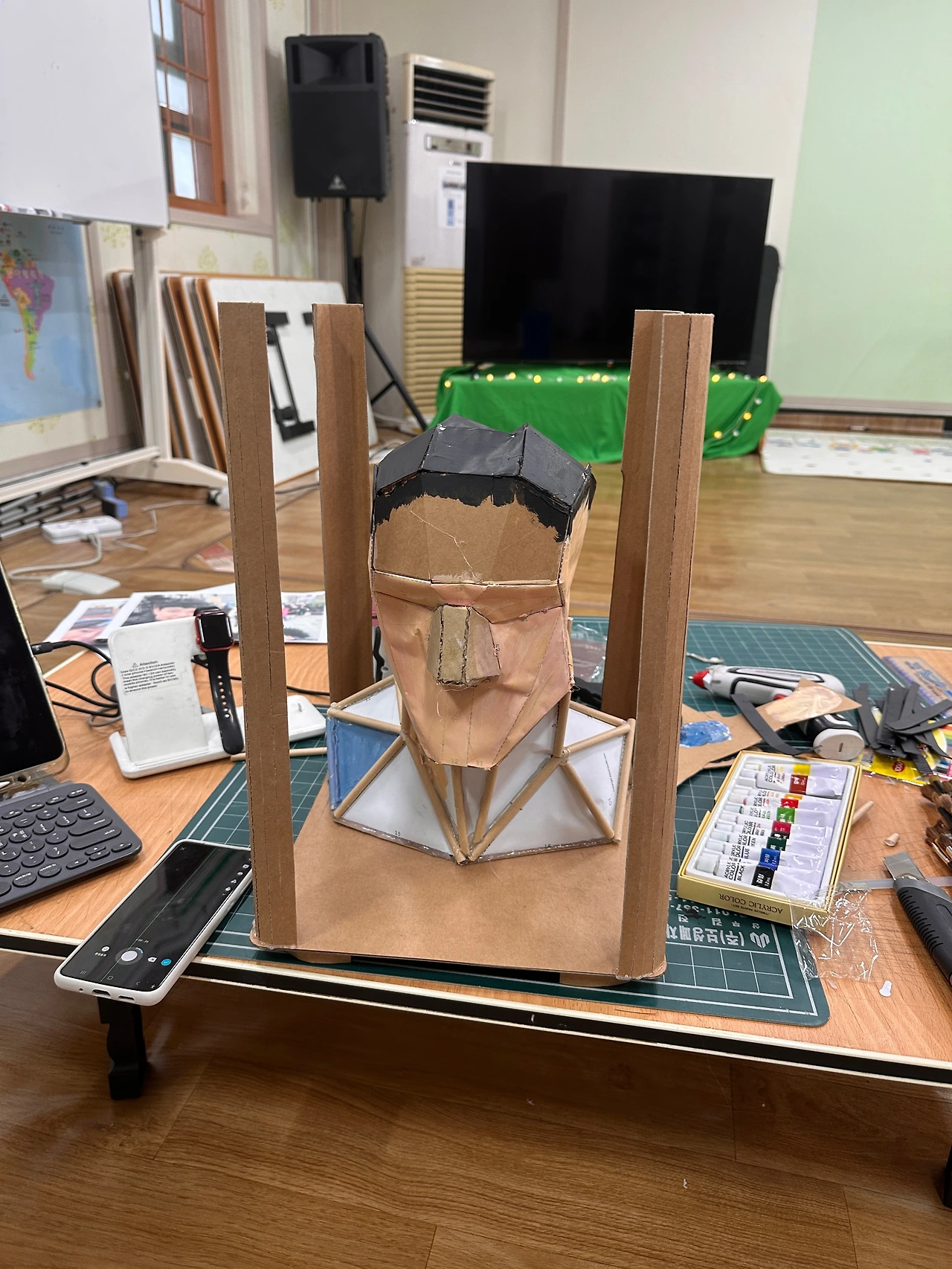 • 피부색 칠하기: 아동부실에 있던 아크릴 물감으로 머리와 피부 부분을 칠했지만, 실제 크기(성인 남자 얼굴) 사이즈다 보니 “너무 리얼해서 무섭지 않을까?”라는 불안이 생겼습니다.