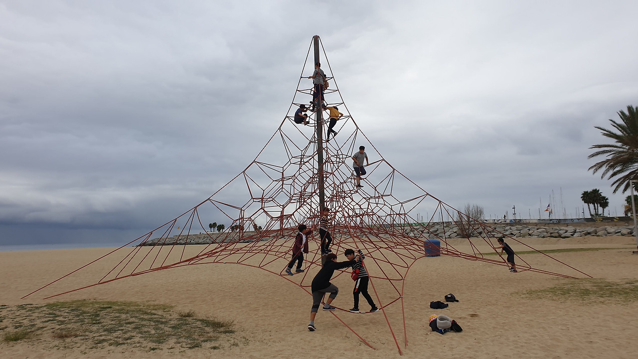 스페인 해변가에는 놀이터가 일정 간격으로 있습니다. 열차를 타고 가다 보면 일정하게 놀이터가 세워져 있습니다. 재미있는 건 놀이터마다 콘셉트가 달랐습니다. 어떤 곳은 미끄럼틀이, 어떤 곳은 간단한 축구장이 있었습니다. 우리가 간 곳에는 거대한 로프 피라미드(피라미드 형태의 정글짐)와 풋살장이 있었습니다. 아이들은 놀이터를 보자마자 소리를 지르며 달려갑니다. 시원한 바닷가와 놀이터는 묘한 느낌을 줍니다. 물에서 놀다 질리면 놀이터에서 신나게 놀라는 신호 같습니다. 아이들과 신나게 피라미드에 올라갑니다. 오랜만에 높은 곳에 올라가니 덜덜 떨립니다. 내색하지 않았다고 생각했지만 이미 아이들은 선생님을 놀리고 있습니다. 짓궂은 아이는 로프를 흔듭니다.
