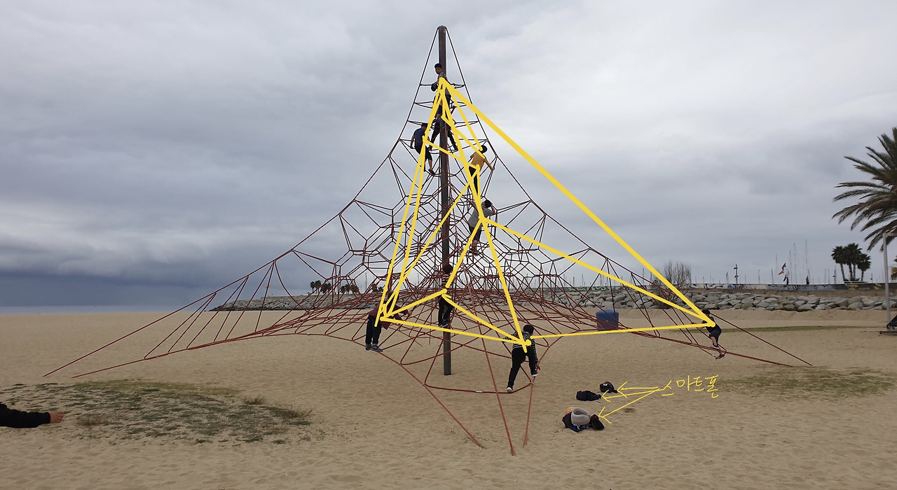 스페인의 느려 터진 인터넷, 어디에나 있는 놀이터, 넓은 해변이 무언가를 하라고 말해주지는 않습니다. 하지만 아이들은 자연스럽게 놀면서 대화를 시작합니다. 스스로 관계를 이어나가기 시작합니다. 숙소에서는 서로 규칙을 만들어 숨바꼭질을 하고 로프 피라미드에서는 서로 왕이 되기 위한 스토리텔링을 시작합니다.