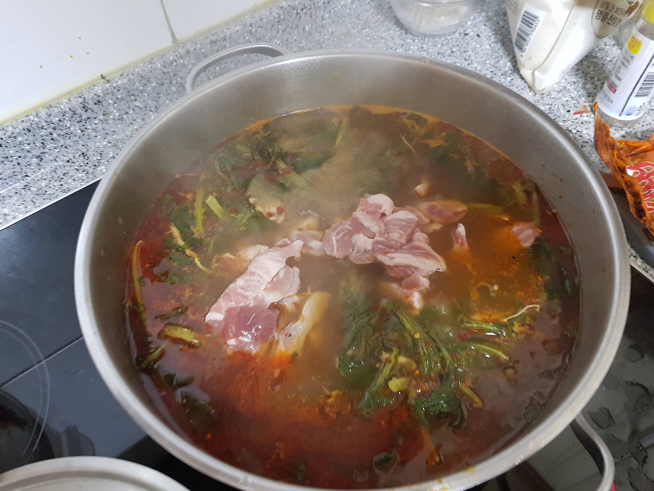 집에 마라 소스가 오자마자 바로 준비했다. 어머니는 그냥 나물만 데쳐 먹고 주무시려고 했단다. 극구 만류하고 집에 있는 나물과 돼지고기를 준비했다. 커다란 솥에 보글보글 물을 끓였다. 원래 소량을 해보고 나중에 해드리려 했지만 그날 또 대충 먹는 모습에 도저히 참을 수가 없었다.