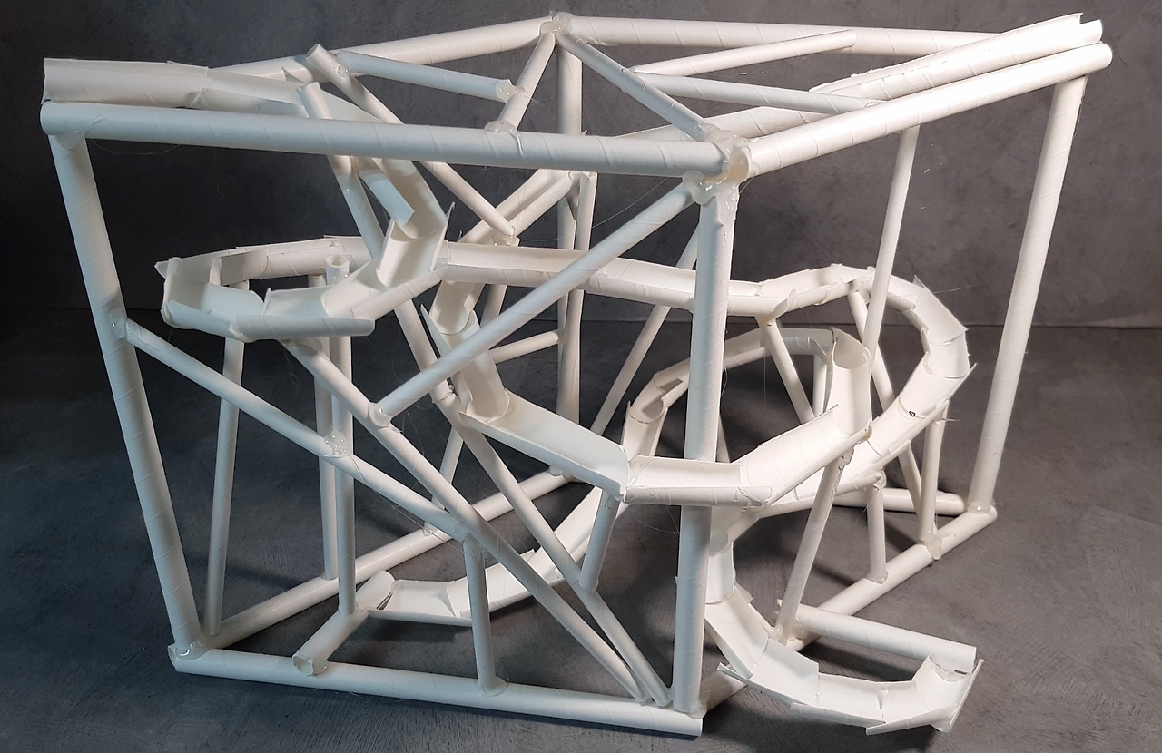 잘 굴러갑니다. 틀 안에 제2, 3의 트랙을 놔두면 더 복잡하게 보이고 멋집니다. 이 작품의 경우는 2개의 통로를 설치했습니다.