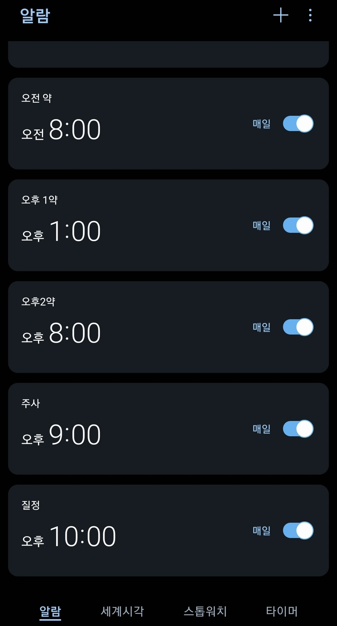 매일 일정 시간에 놓치면 안되는 약, 주사, 질정 스케줄 알람이다.