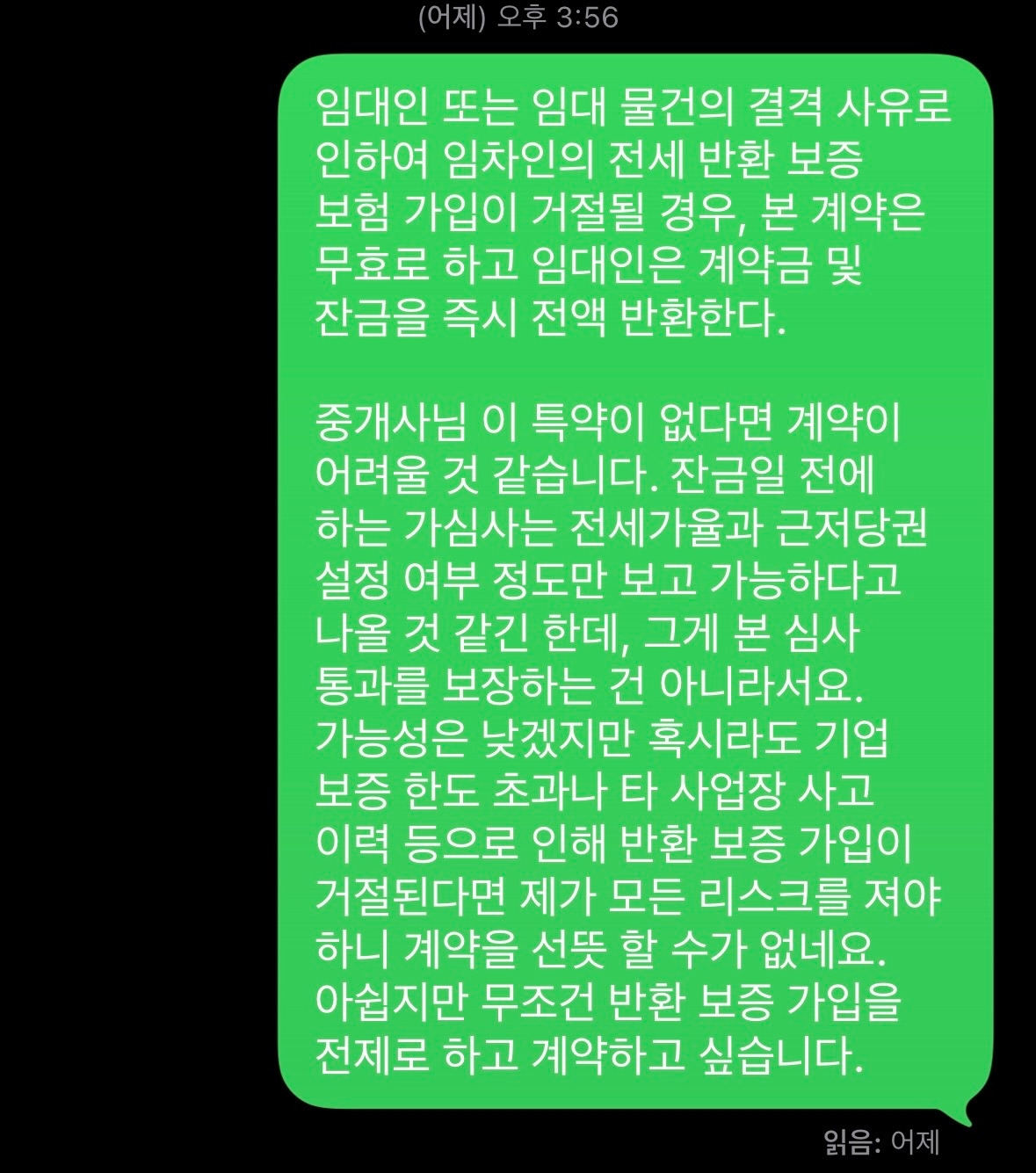 "전세금 반환 보증보험 가입이 거절될 경우 본 계약은 무효로 하고, 임대인은 받은 계약금 및 잔금 전액을 즉시 반환한다."