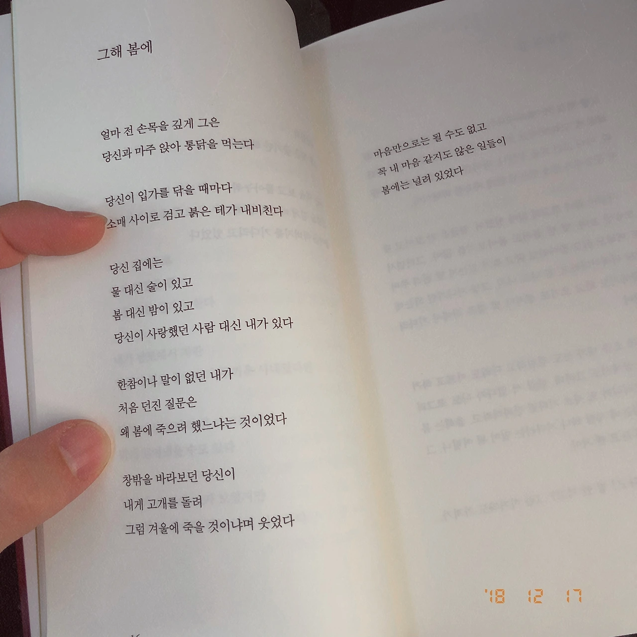 쓸모를 증명하려 바둥거리는 취준생인 내가 유일하게 죄책감 없이 일탈하는 시간이 시를 읽는 시간이다. 비록 시를 읽으려 무거운 책가방에 한 권을 더 챙겨가는 수고와 아르바이트 시작 전에 잠시 읽고자 30분 일찍 출근하는 수고를 들여야 할 때도 있다. (이 정도 수고는 사실 취준생 모두가 경험하는 찌질한 무력감에 비하면 가볍기만 하다) 그렇게 잠시 가방을 내려놓고 시를 읽을 때면 예민하고 예리한 시선으로 무언가를 발견하는 시인들의 시선과 사유를 나에게 닿게 하여 세상을 조금 더 다양하게 바라보게 된다. 시인의 언어와 나의 마음의 온도를 맞추고 시선을 주고받으며 활자의 감정을 톺아가다 보면 운명처럼 나에게 닿는 순간을 경험할 때가 있다. 그때 오는 희열의 기억이 계속 시를 찾게 한다. 가끔은 웃기게도 시를 읽으며 경험한 시인의 시선과 사유가 내 것이 된 것 같아 나름 내가 이 사회 속에서 썩 나쁘지는 않은 사람, 그래도 마냥 버려지기에는 너무나 아까운 적당한 값어치가 있는 존재로 느껴지기도 한다.