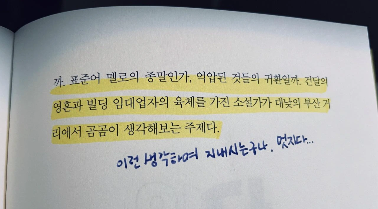내가 부산 거리를 거닐었으면 '그 부산 사투리 영화 재밌다' 혹은 '해운대 저 빌딩 집값 엄청나겠다' 정도 얘기하며 지나갔을 텐데... 김영하 작가님의 자유로운 생각의 폭이 삶의 풍요로움을 보여주는 듯했다. 내가 보기엔 부와 명예가 넘치는 사람보다 김영하 작가님이 더 풍요로워 보인다. 비결은 뭘까. 집에서 함부로 앉지 않고 누워있는 게 그 비결일까. 정말 그럴지도 모른다. 최선을 다하지 않음으로써 생긴 틈과 에너지는 주위를 둘러보게 한다. 우리의 인생을 풍성하게 만드는 건 최선을 다하지 않은 여집합의 시간일지도 모른다.