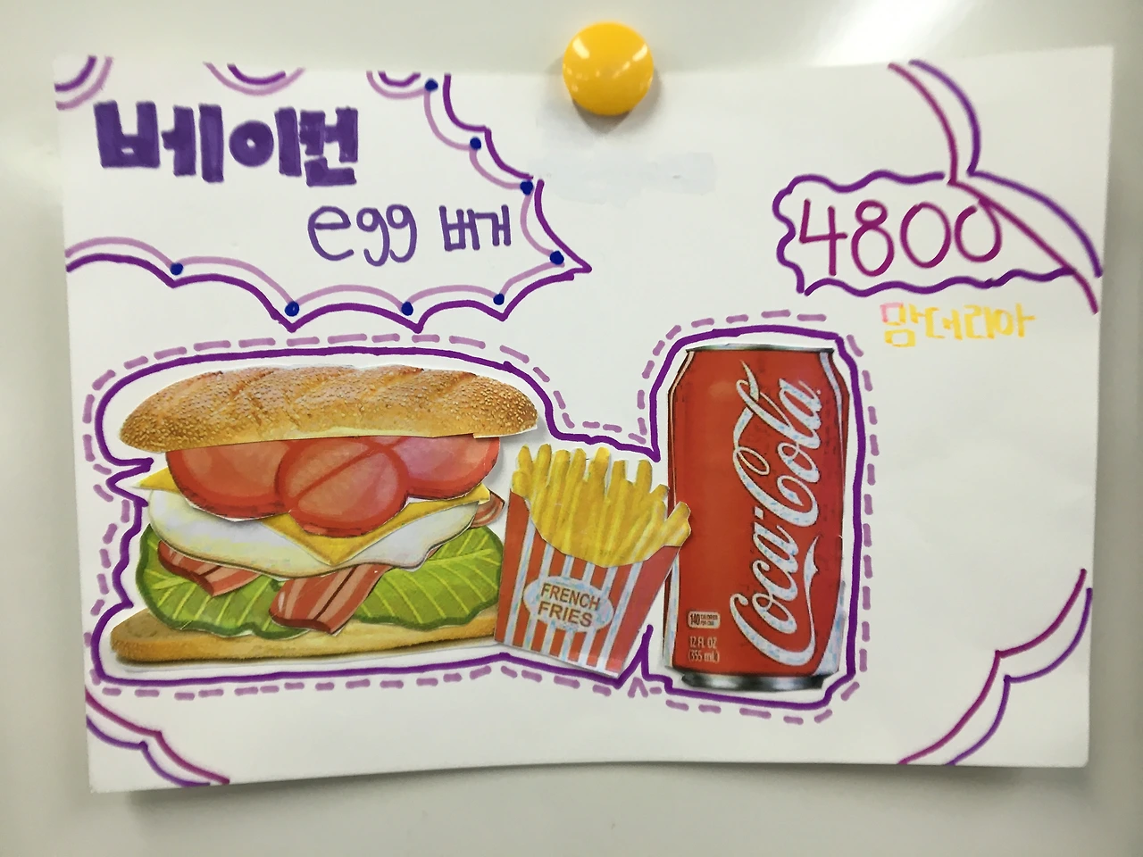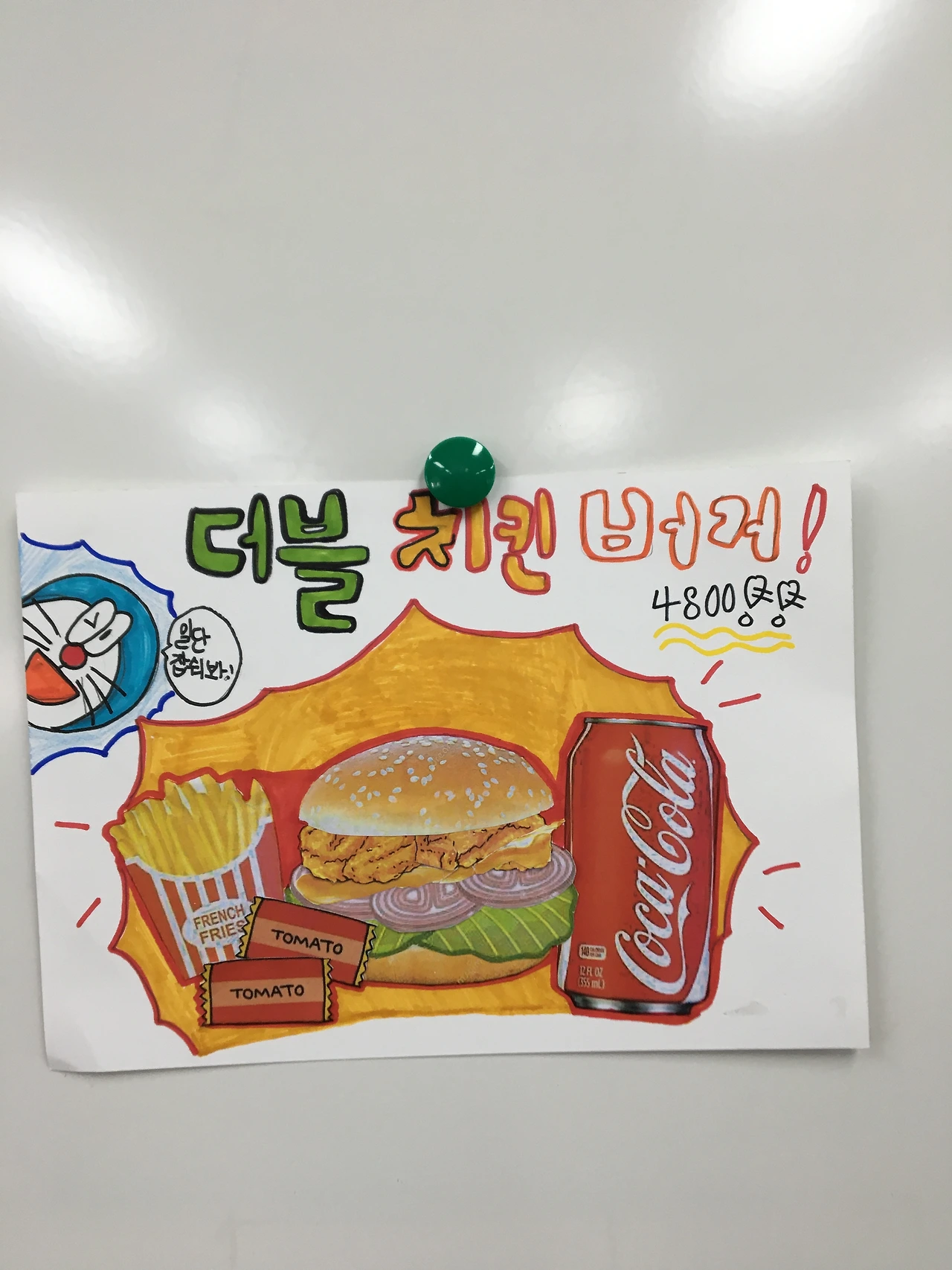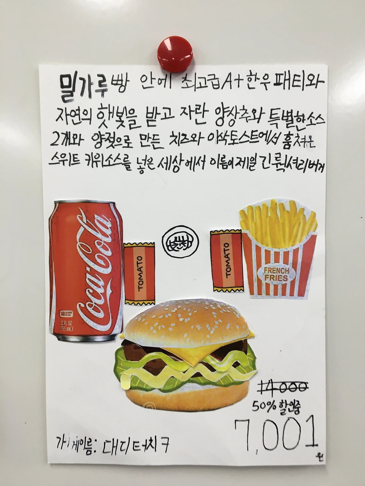 기발하다고 생각했던 건 할인 표시를 한 모둠들이다. 할인가뿐만 아니라 원가도 노출시켜 이 버거를 먹는 게 얼마나 이득인지 심리전을 펼쳤다. 평소 광고나 마트 진열대에서 물건을 잘 관찰하지 않았을까. 그런 아이들은 이게 상술이라는 걸 모르지 않을 터. 역시 6학년은 똑똑하다.