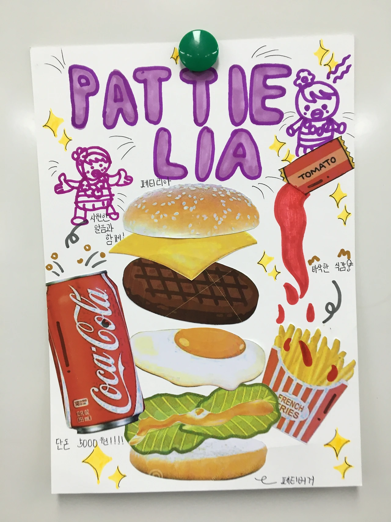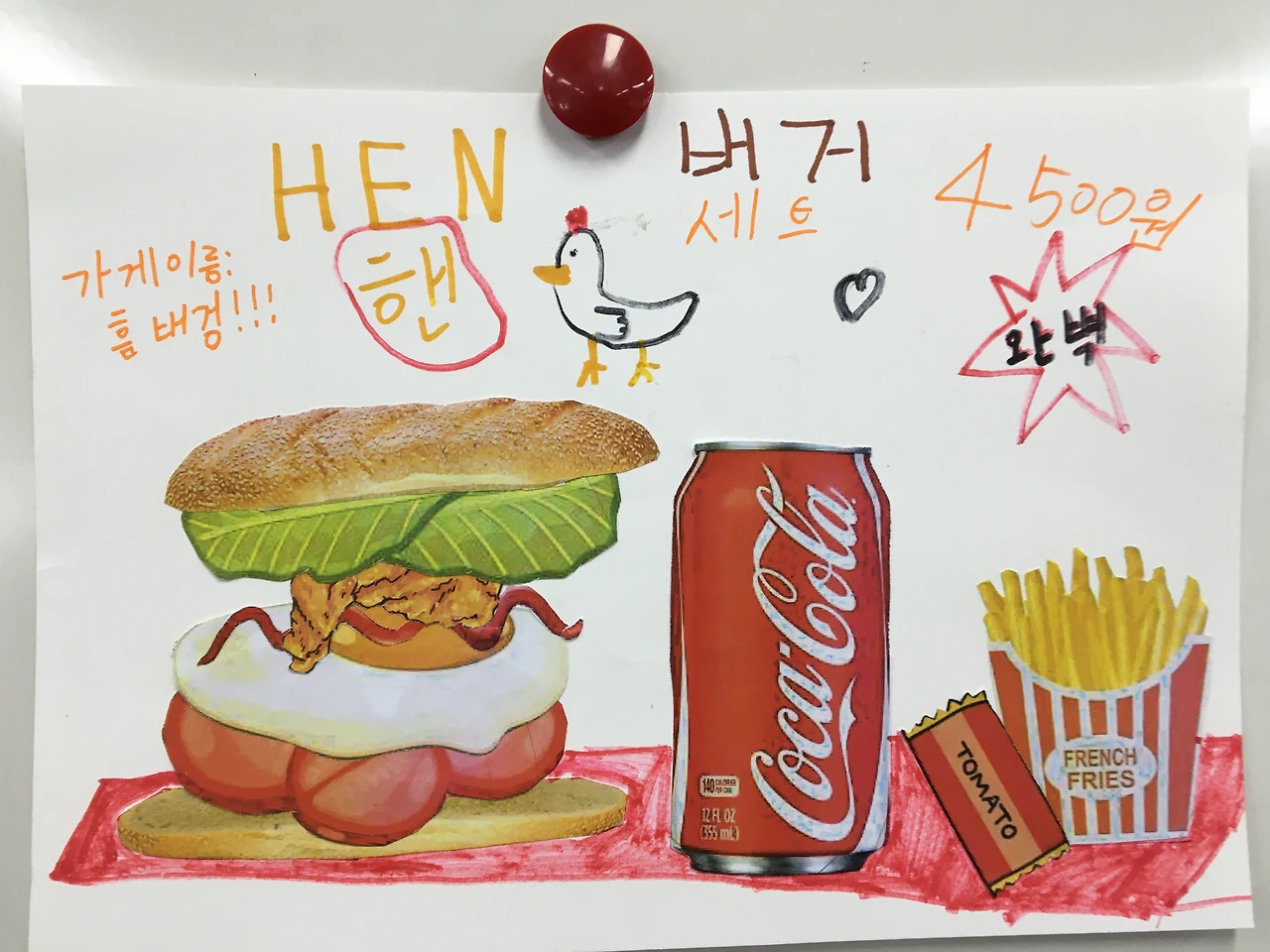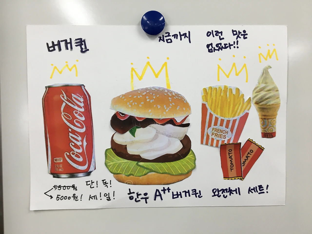 기발하다고 생각했던 건 할인 표시를 한 모둠들이다. 할인가뿐만 아니라 원가도 노출시켜 이 버거를 먹는 게 얼마나 이득인지 심리전을 펼쳤다. 평소 광고나 마트 진열대에서 물건을 잘 관찰하지 않았을까. 그런 아이들은 이게 상술이라는 걸 모르지 않을 터. 역시 6학년은 똑똑하다.