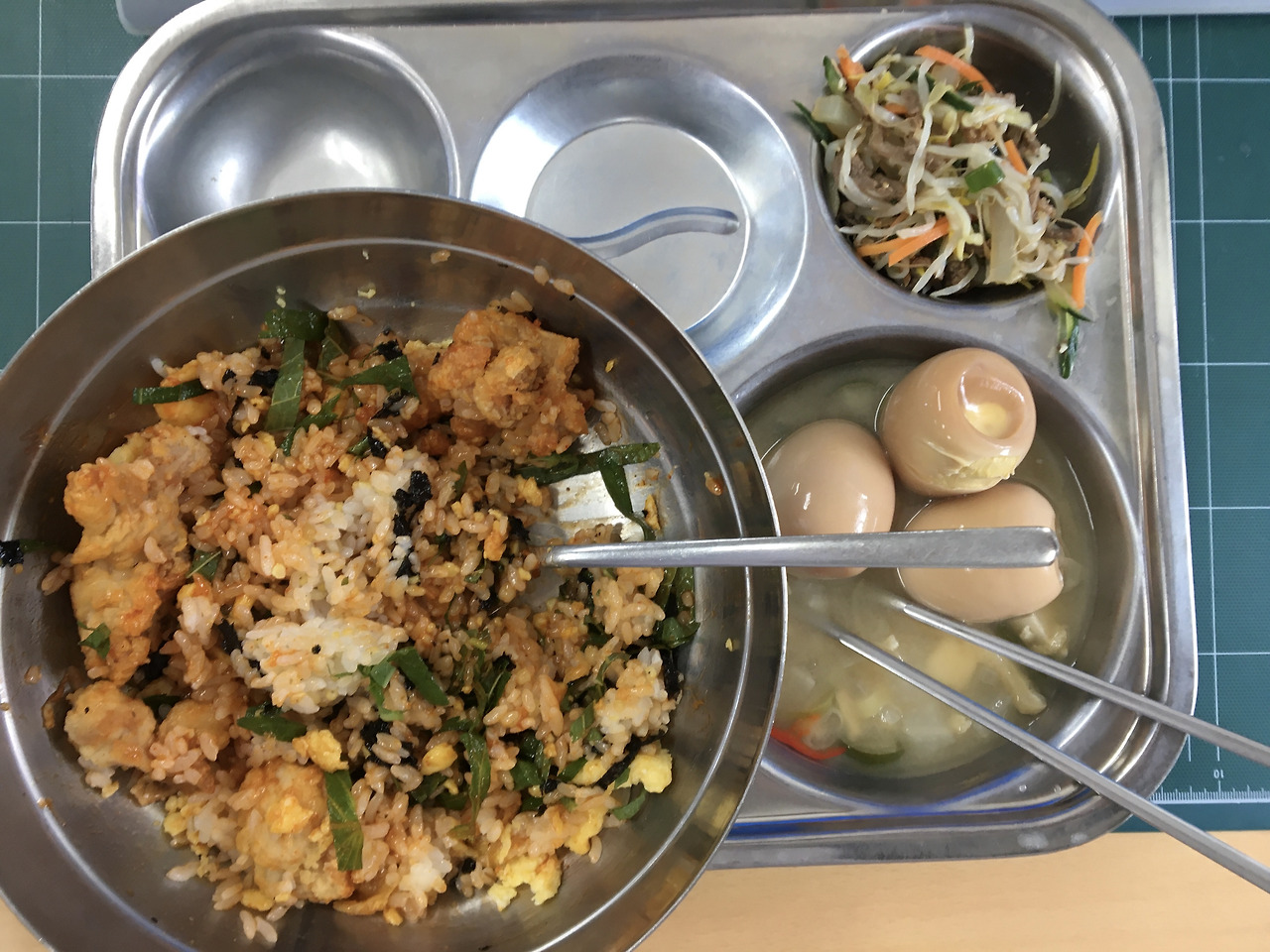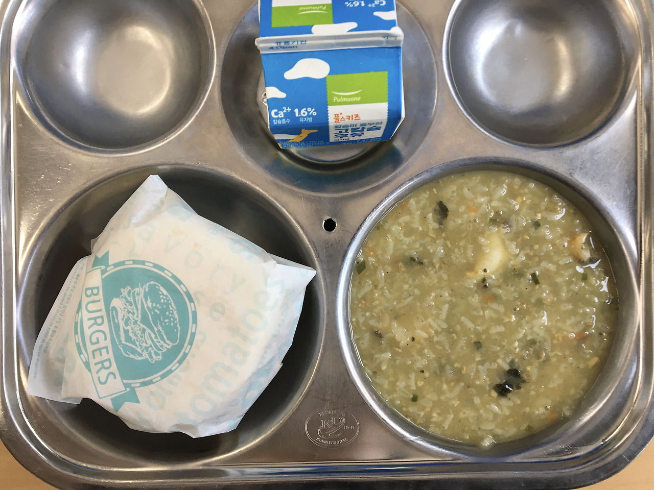 또 기성 반찬을 통에 담기만 하시는 일도 하지 않으셨다. 최대한 뭐라도 더 넣어 담으려고 하셨다. 도라지 무침을 사시면 사과라도 채 썰어 넣으시는, 간도 심심하지 않게 하시는 정성이 들어가 있었다. 아무렴 이게 급식이지 싶다. 아쉬운 건 예산이 부족해 항상 실력 발휘를 하지 못하신다는 거다. 일주일에 두세 번 특히 수요일에 맛있는 급식이 나오는데 전파를 탄 그 영양사 선생님 못지않게 새로운 걸 많이 도전해 주신다. 너무 감사하다. 맛없어 보이는 건 다 내 사진실력 탓이다. 양념치킨 덮밥은 한번도 맛본 적 없는 새로운 맛이었는데 옆에 계란은 내가 가져온 거다. 전복죽에는 탱글탱글한 전복이 정말 많았다. 개인적으로 3번 같은 무난한 식단을 가장 선호한다. 빨고, 검고가 나오는.
