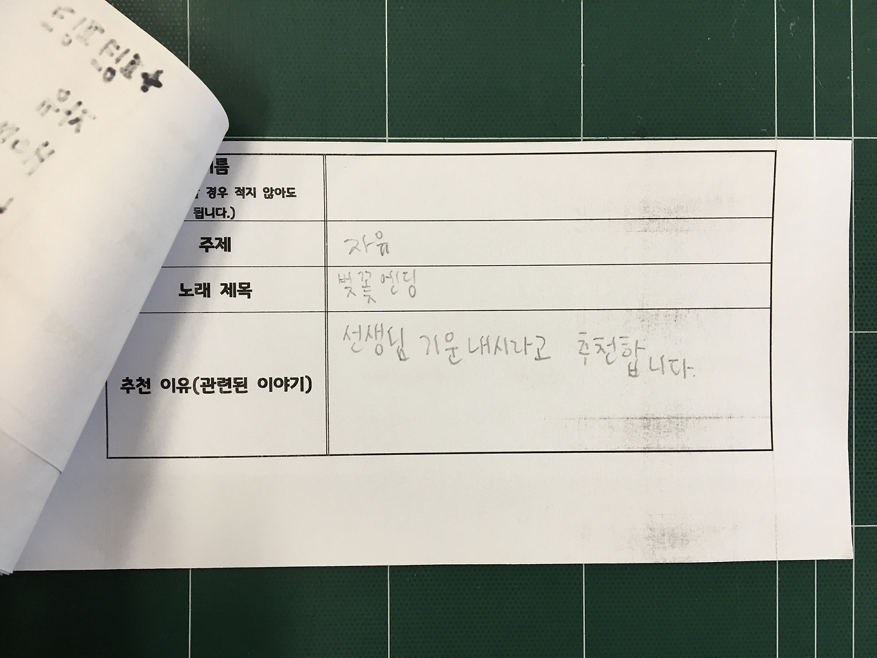 문제는 저번 달에 분명히 얘기했었는데 이번 달에도 벚꽃 엔딩이 떡하니 종이에 적혀있었다는 거다. 신청 사유가 '선생님 기운 내시라고 신청합니다'였다. 갸륵한 마음에 눈물이 핑 돌 뻔했다^^.