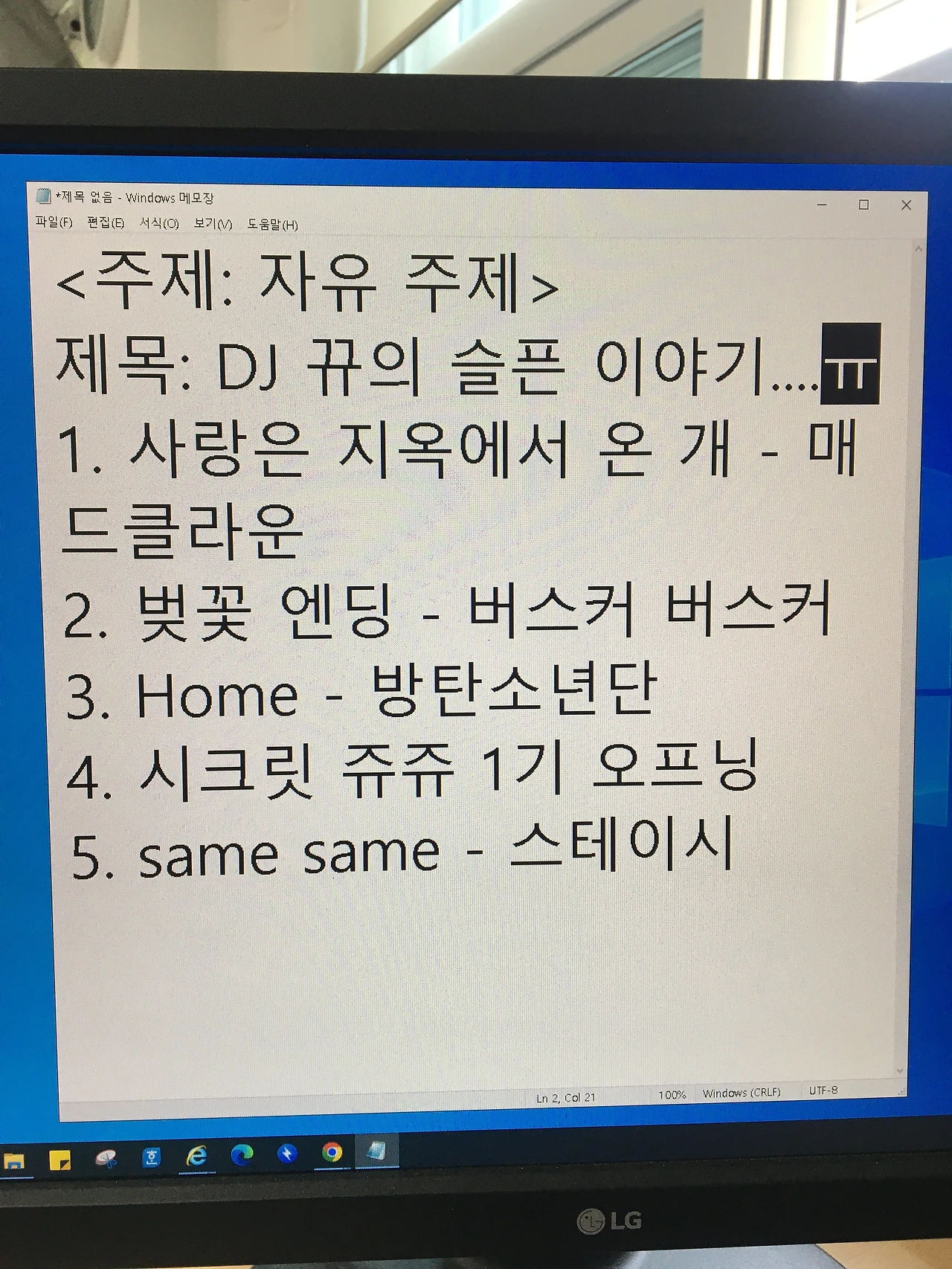 이번 달은 자유 주제다. 그래서 사연 신청이 많았다. 사연은 별명을 쓸 수 있다. 이번 달도 기상천외한 닉네임이 많다. '앙 나 츕팝츕스 포도맛 핌ㅋㅋㄹㅃㅃ', '화장실 요정', '월요일 좋아'가 대표적이다. '앙 나 츕팝츕스 포도맛 핌 ㅋㅋㄹㅃㅃ'은 처음에 무슨 말인가 했다. '판다'의 활용형인 '팜'을 잘못 쓴 거라고 생각했는데 아이들에게 물어보니 '피다'의 활용형이라고 대답했다. 그러니까 담배 대신에 포도맛 사탕을 핀다는 얘기인 거 같다. '화장실 요정'은 신청곡이 '내 똥꼬는 힘이 좋아'였다. 엉뚱한 제목에 유튜브에 떠돌아다니는 노래라 생각했는데 무려 유세윤이 부른 대중가요였다. '월요일 좋아'는 우리 반에서 매주 월요일에 틀어주는 노래라 아이들이 지겨워했지만 난 뿌듯했다. 내 세뇌가 효력을 발휘하고 있다.