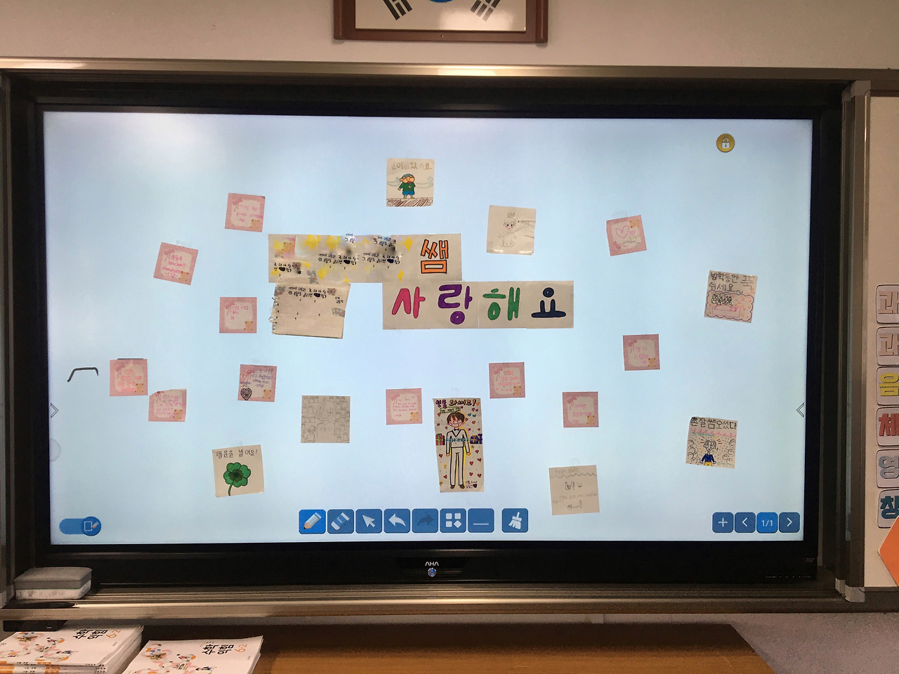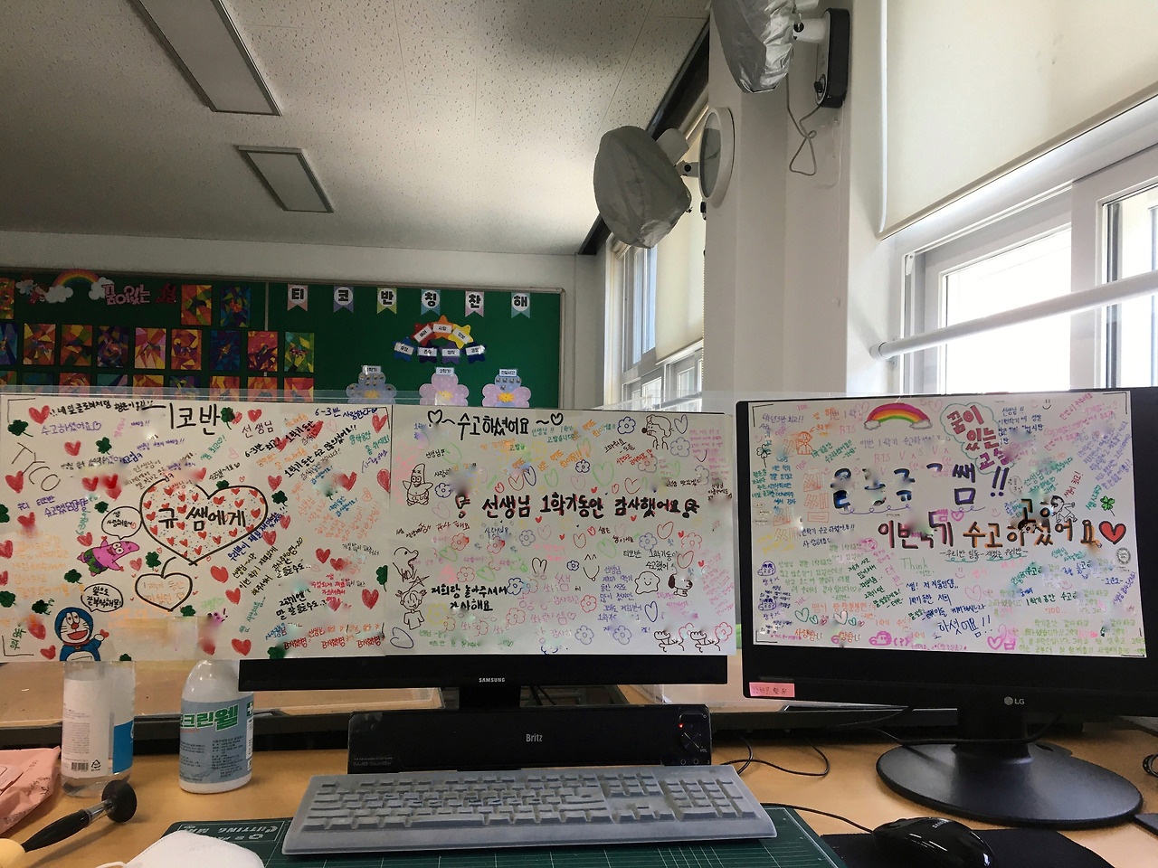 말하는 중 종이 쳐서 애들을 보내고 터덜터덜 올라갔더니 우당탕탕 들리는 소리. 칠판과 컴퓨터에 덕지덕지 붙어 있는 편지들.