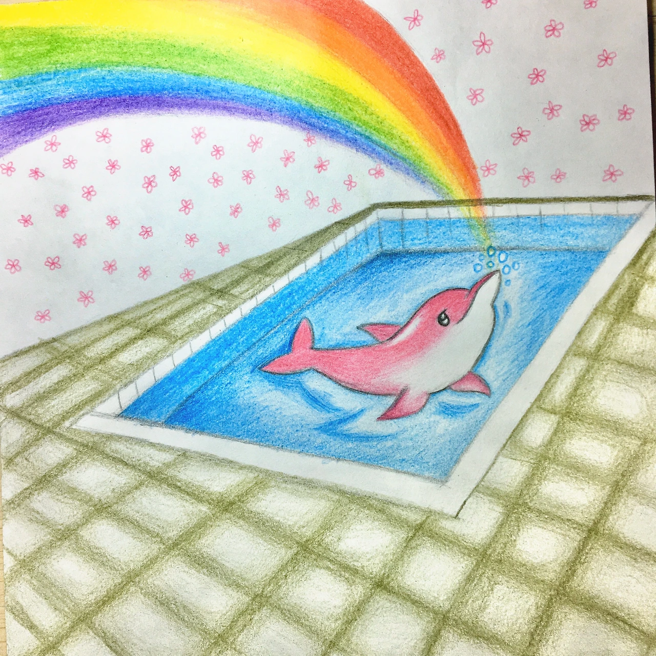 그래서 나 또한 그 그림이 기억에 남았다. 그가 그림에 대한 자기의 이야기를 말해줘 그림에 생명력을 불어넣었다. 나는 그에게 바로 그 긍정적인 그림을 그려주고 싶어 졌다. 그래서 내 손으로 도화지를 사고 색연필도 샀다. 정말 오랜만에 그림을 그린다. 내가 수영장에 대한 좋은 기억을 만들어주고 싶어 졌다. 수영장의 크기를 조정하고 무지개의 위치, 방향, 어떤 돌고래를 그릴지 열심히 생각해두고 그와 헤어진 뒤 떠오른 김에 바로 스케치를 시작했다. 그와 나의 지금 관계가 어떠하던 내가 그에게 어떤 마음을 가지고 있던 모르겠지만 그림을 그리고 싶어 졌다. 그는 나의 영감을 불러일으킨다.
