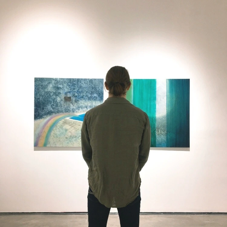 또 다른 갤러리에서 그가 두 작품을 사이에 두고 똑바로 서서 그림을 바라보고 있었는데 나는 그 순간 그림과 함께 서있던 그의 모습이 좋았다. 몰래 그 모습을 카메라에 담았다. 파란, 녹색 계통의 작품의 컬러감과 그가 입은 옷, 신발, 정확이 그 사이에 위치한 그의 모습이 아름다웠다. 사진을 보여주고 나서 그는 맘에 들어했다. 자기는 항상 사진을 찍어주는 사람이었지 누군가 자신을 찍어주지 않았는데 정말 기쁘다고 했다.