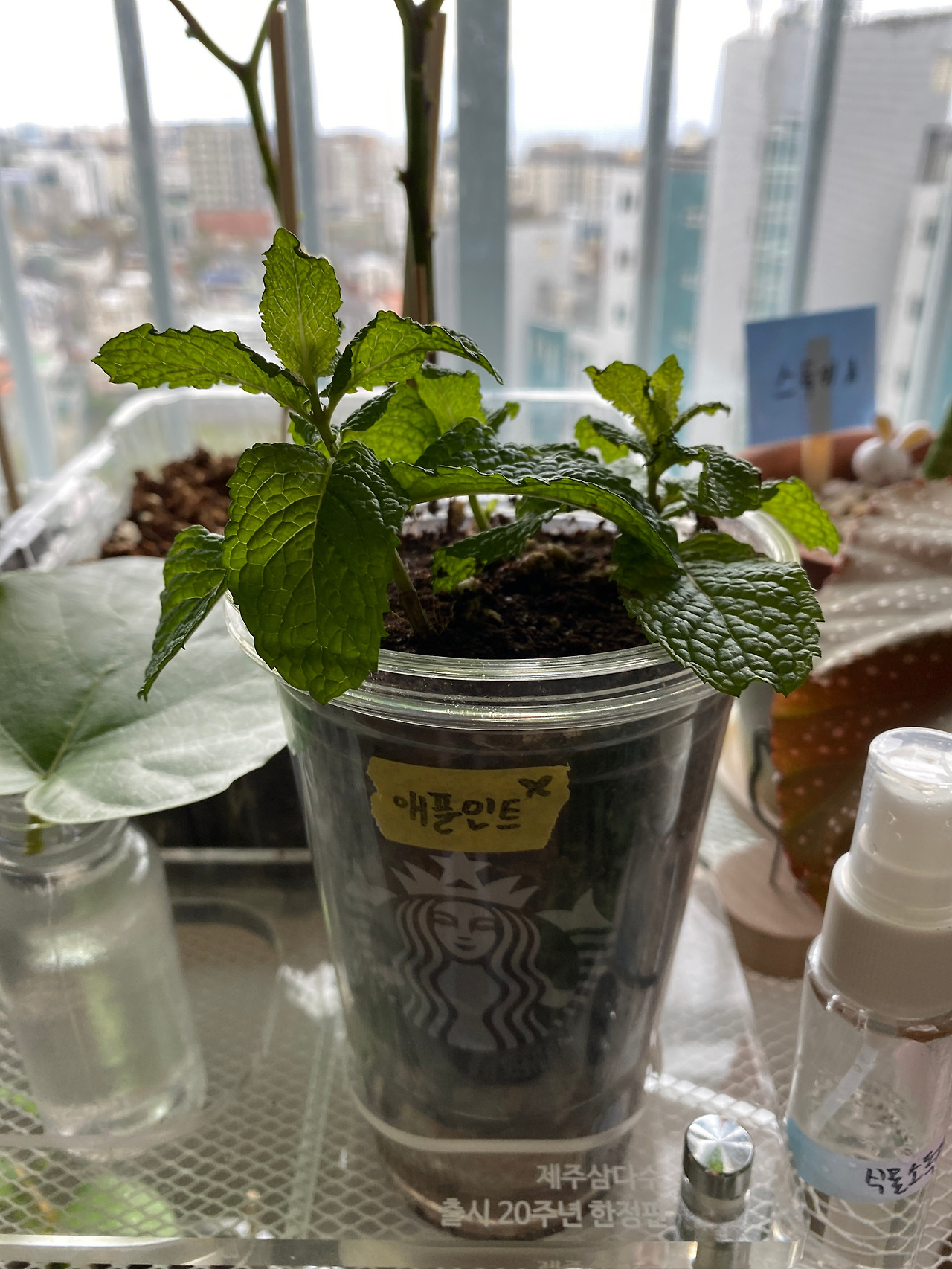 텃밭에서 무성하게 잘 자라던 스피아민트의 가지를 조금 잘라 실내에서 물꽂이 한 지 일주일 만에 아주 건강한 뿌리가 자라났다. 환경이 눈에 띄게 척박해졌는데도 굉장한 성장세였다. 뿌리가 어느 정도 길어지고 난 뒤, 커피 컵 화분에 옮겨서 다른 화분들 사이에 놓아주었다. 확실히 새 식구가 늘어난 느낌이 들었다. 텃밭에서 무심히 잘 자라던 처음처럼 앞으로 자라게 될 환경에도 잘 적응해줬으면 하는 내 마음을 잘 알아주기를 바랄 뿐.