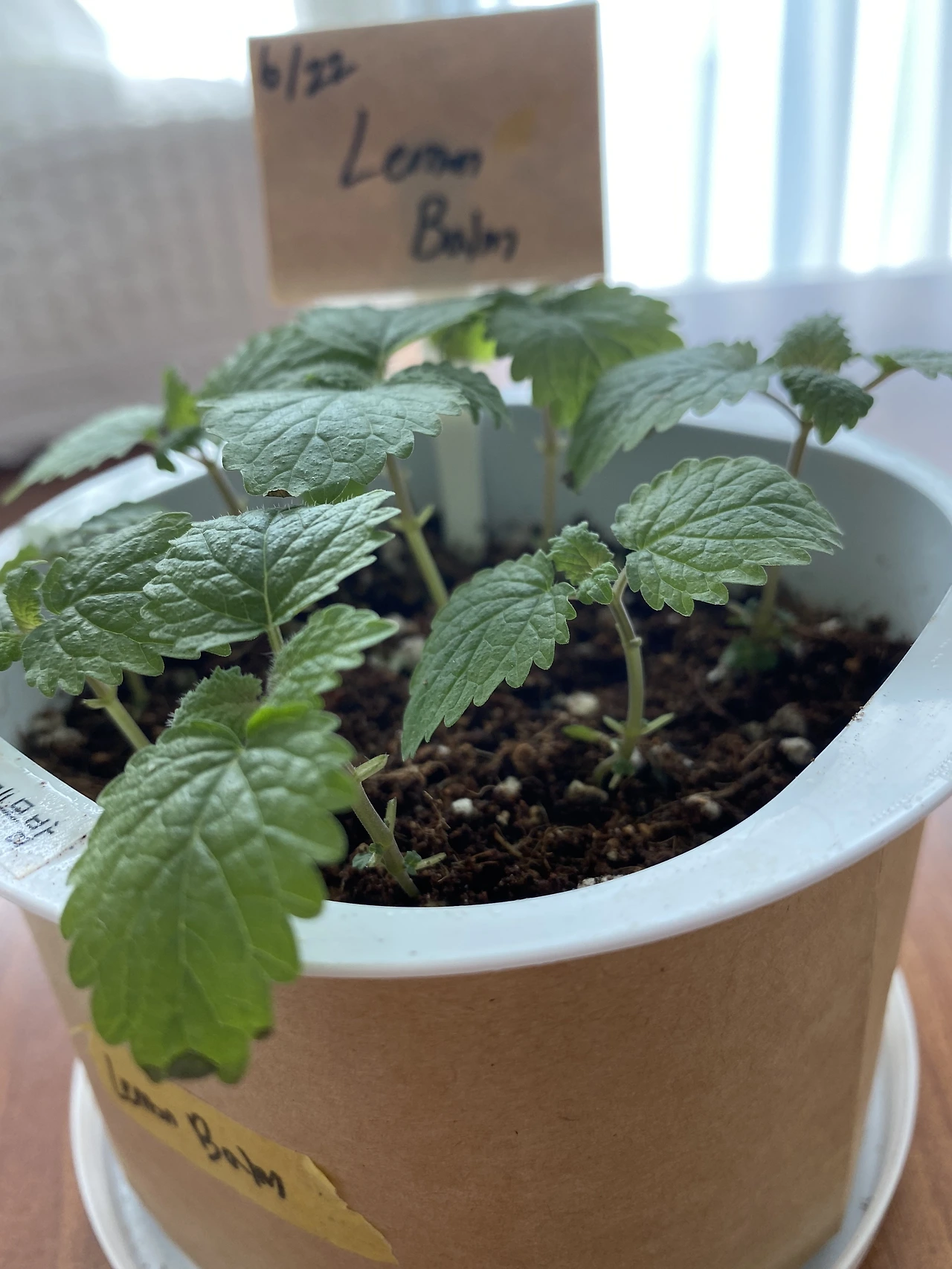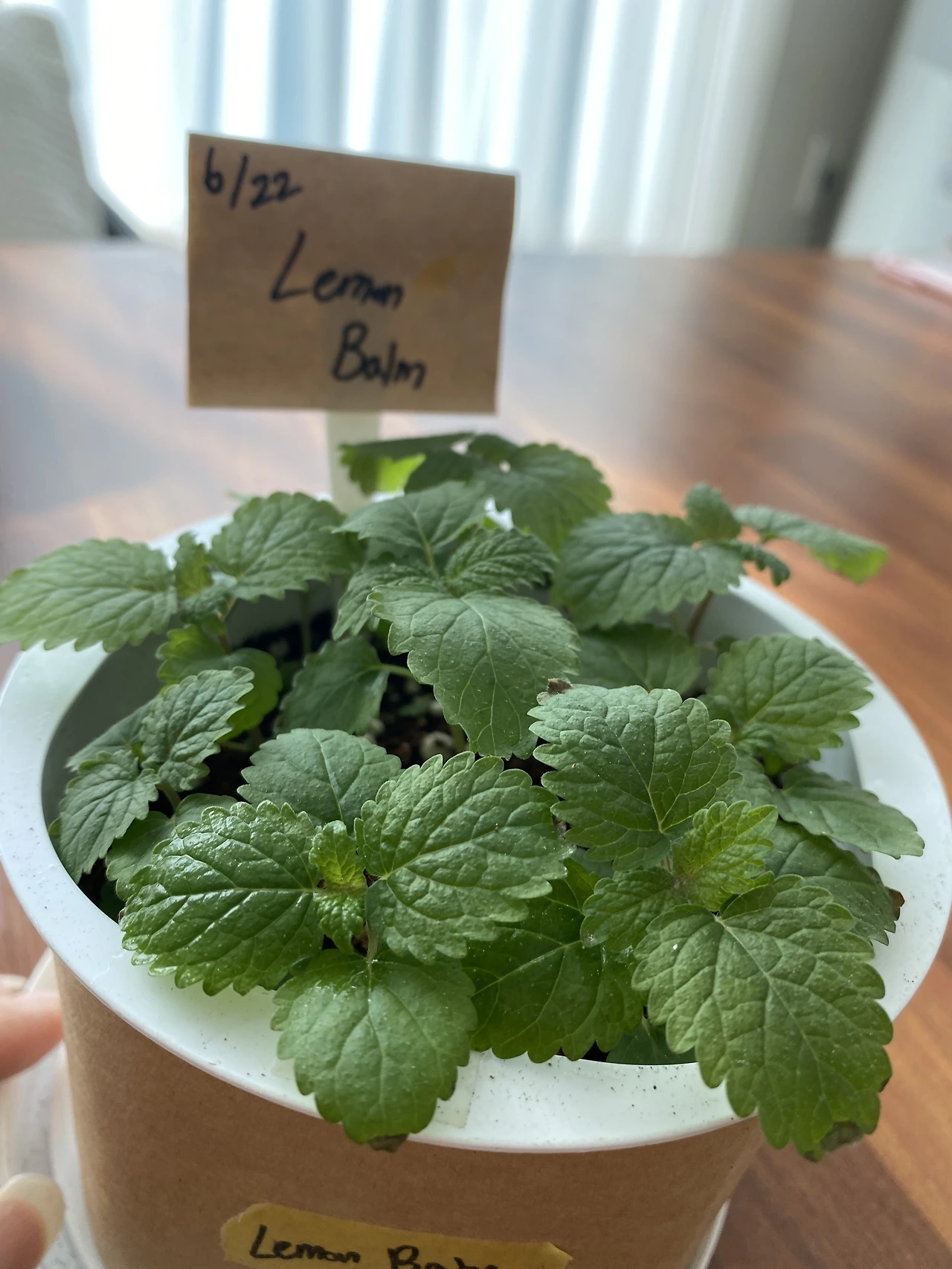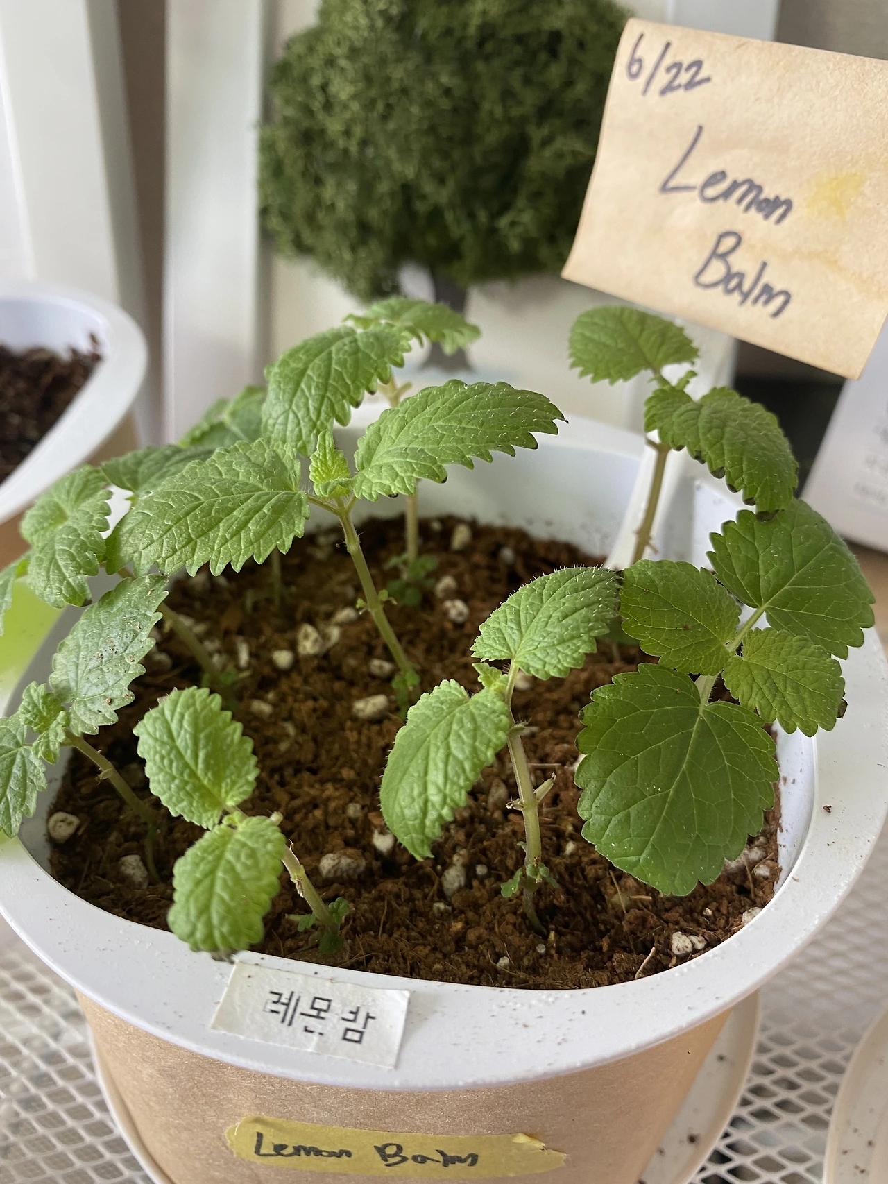 한 달이 지났다. 여름철 식물은 워낙 빨리 자라기 때문에 그 과정을 잘 찍어줬어야 했는데, 다른 친구들보다 기록에 큰 열정을 들이지 못했다. 그동안 레몬밤의 성장 환경에는 변화가 찾아왔다. 레몬밤은 그간 채광이 약한 발코니에서 키웠는데, 내가 여름에 이사를 하게 되면서 채광은 물론, 풍경까지 개선되었다. 여름을 지나며 레몬밤은 본잎을 틔워냈다. 흡사 깻잎 같은 모습에 잡초처럼 느껴지기도 했지만 나름 어엿한 허브다. 레몬밤 물 공급 주기는.. 음. 솔직히 말하면 잊을만할 때쯤 주며 키웠다. 다행히 내 기대보다 더 잘 자라고 있다.