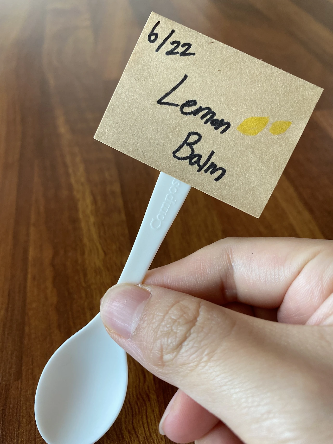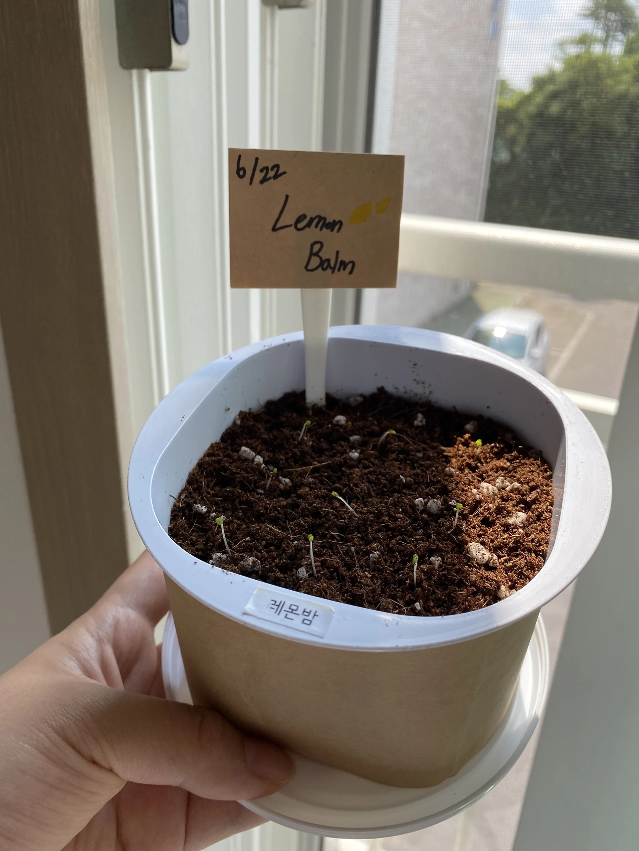6월 22일. 레몬밤 식재를 위해 이름표를 만들어주고 3*3 대열로 심어줬다. 아직 순이 작기 때문에 큰 화분을 사지는 않았고, 요플레 통을 씻어 임시 화분을 만들어주었다. (나름 재활용. 크래프트지도 둘러 씌워 주었다.) 어, 나 좀 소질 있나 봐.(???)