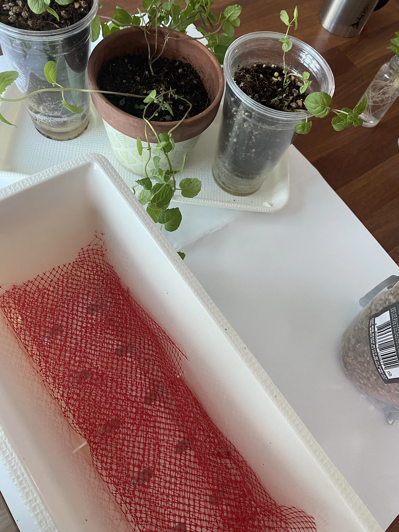 비실비실했던 페퍼민트 중 살아나는 조짐을 보인 친구들은 위와 같이 총 세 개의 임시 화분에 식재해 줬는데, 군집을 지어 자라는 허브의 특성상 모두 합사 하는 것이 생장에 도움이 될 거 같아 길고 깊은 화분을 구매했다. (구매처는 이마트!) 이제 정말 마지막 분갈이가 되기를 기도하며 민트 줄기를 하나하나 정리했다. 참고로 허브는 배수가 중요하다고 해서 흙 배합은 마사 5 : 배양 5로 했다. 깔망은 양파포장망 재활용 ㅎ_ㅎ