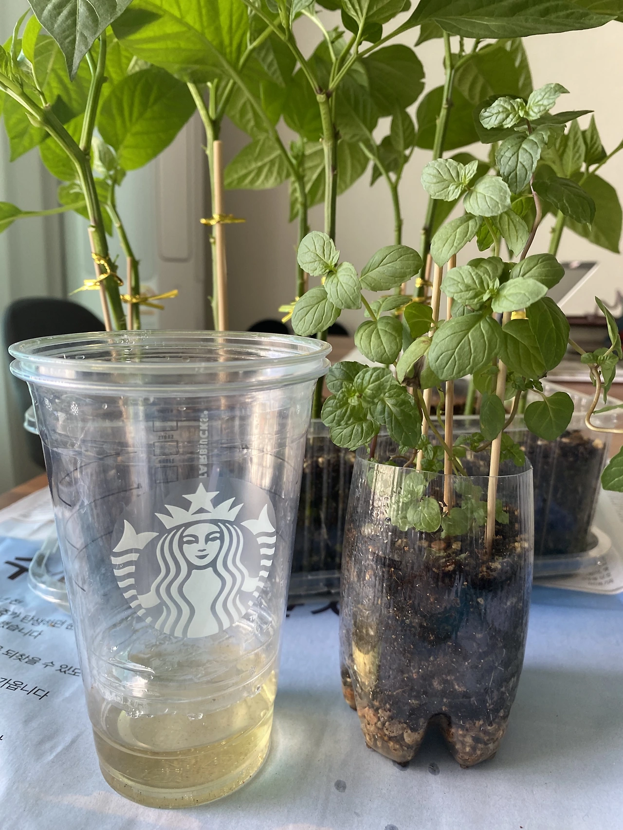 왼쪽 사진의 페퍼민트는 당초 요플레 통에 있던 작은 친구들을 투명 컵화분에 옮겨둔 후의 근황이다. 이 친구들은 옮겨심기도 그래서 일단 놔두었는데 투명 컵이라 햇볕이 잘 드는 편이었는데도 불구하고 줄기가 여전히 얇게 자라나서 포기할 수밖에 없었다. 가운데와 오른쪽 사진의 페퍼민트는 물꽂이, 흙삽목 이후에 가장 건강하게 자라던 아이여서 토분과 별도로 큰 화분으로 옮겨주었다.