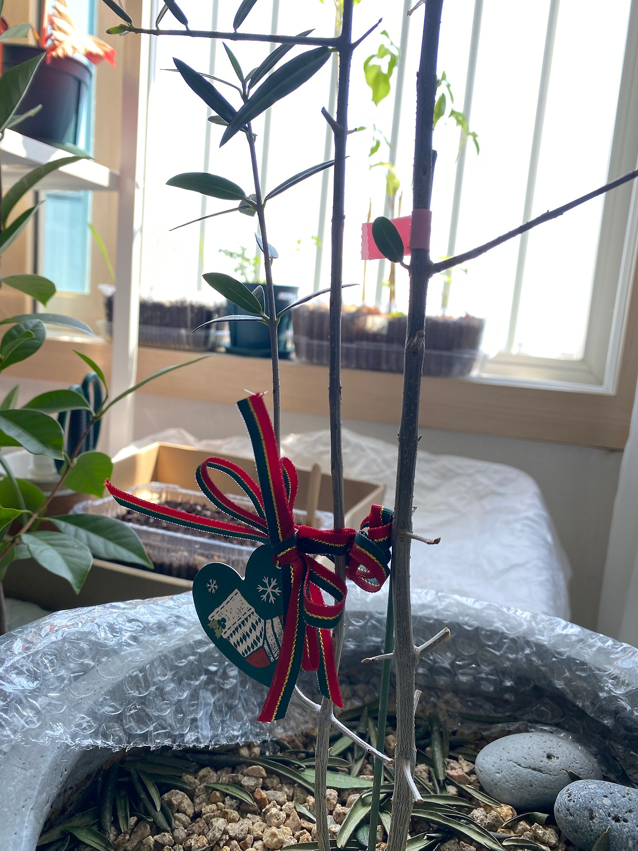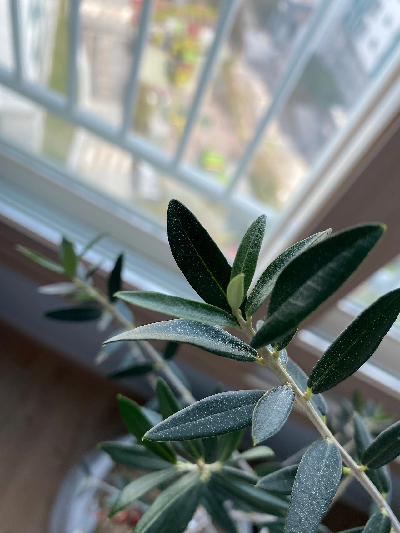물론 머리로는 분명 이해되는데, 막상 식물의 잎이 떨어지는 것을 보고 있으면 그런 인내심과 여유가 생길지 자신은 없었다. 그러다 겨울이 왔고 우리 집 첫 번째 주자는 올리브가 되었다. 가늘고 둥근 모양이 특징인 올리브 잎은 겨울을 잘 보내고 2월에 접어들면서 맨 아래쪽부터 하나하나 떨어지기 시작했다. 봄이 오기까지 꼬박 한 달 내내 그랬다. (사진은 떨어진 잎을 몇 번이고 치운 뒤에 찍은 것이기 때문에 올리브가 떨어뜨린 잎은 보기보다 정말 많았다.) 그러다 보니 풍성했던 올리브는 온데간데없고 위쪽만 잎이 듬성듬성 남아있어 볼품없어 보이기까지 했다. 이건 분명 고사 직전 상태라는 자체 판단 하에 나는 결국 못 참고 영양제를 꽂기도 했지만 별 수 없었다. 유일한 희망은 묵은 잎 가고 새잎이 온다는 순리뿐이었다. 봄이 오면 다 죽은 것처럼 보이는 이 올리브에도 거짓말처럼 새 잎이 풍성하게 돋아날까.