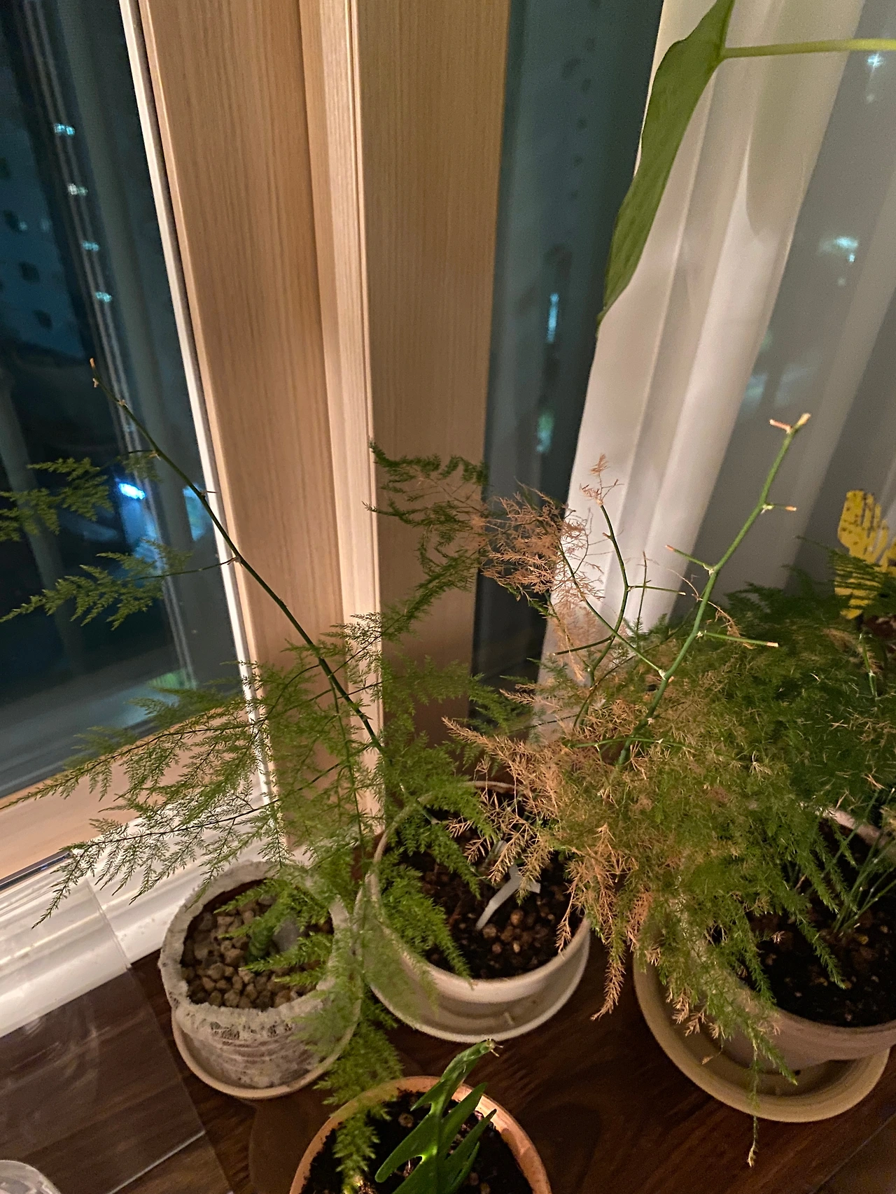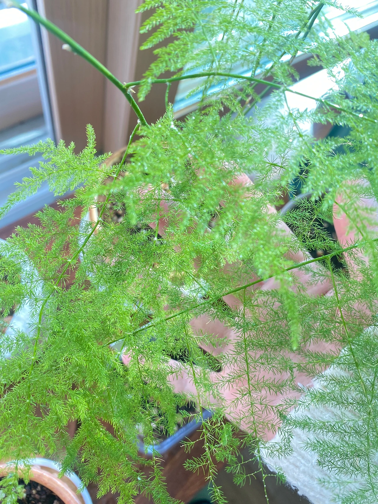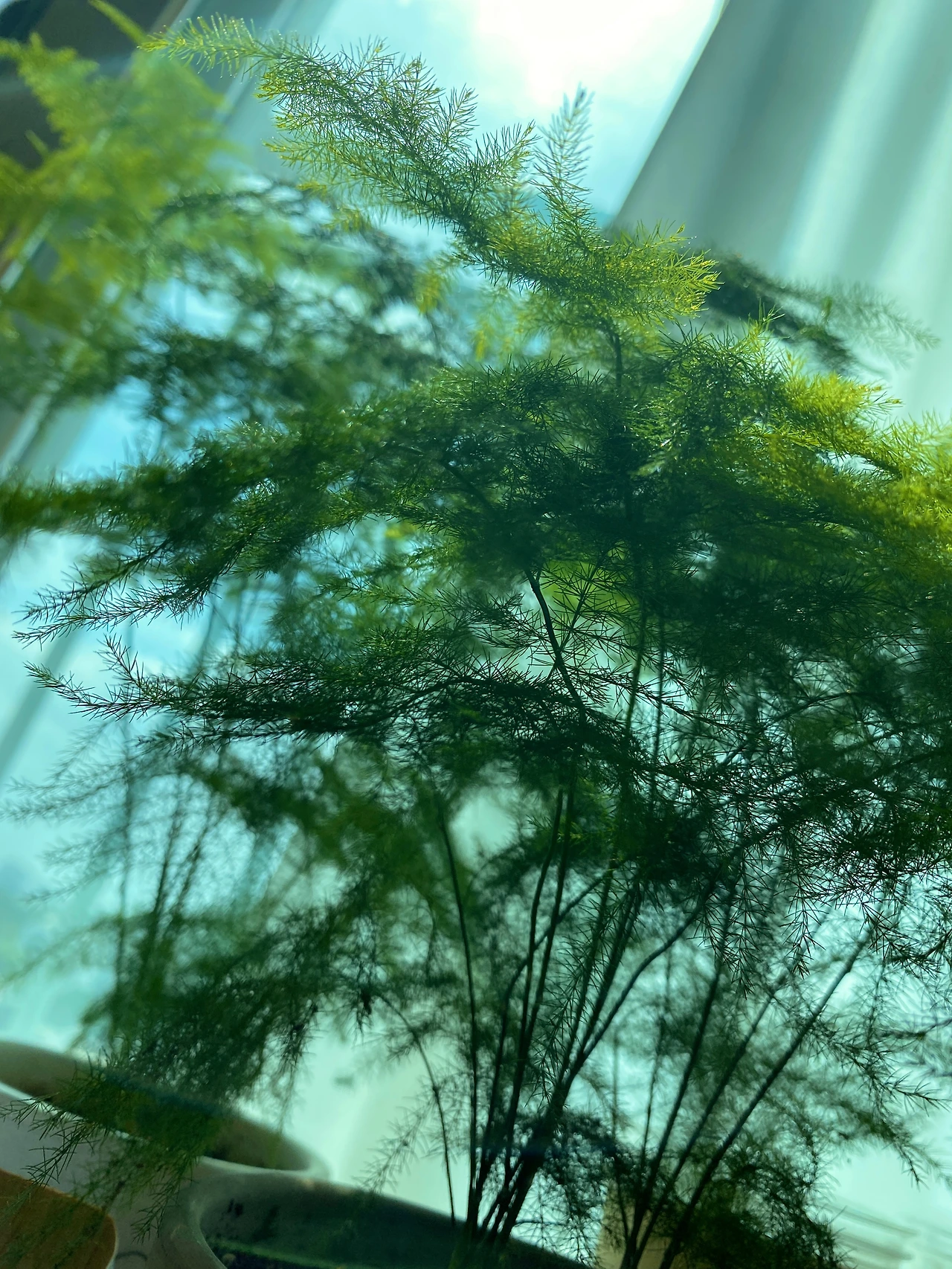 아스파라거스를 처음 본 것은 동네의 한 카페에서였다. 친구와 커피를 마시다가도 힐끗- 다시 바라보게 되는, 아 이것은 분명한 하트시그널. 다행히 단골 도매상에도 입고되어, 부리나케 모셔오게 되었다. (부디 저희 집에서 잘 지내주세요 굽신굽신) 야외에서 키우시는 분들도 있지만, 추위에 약해서 실내에서 키우는 것이 바람직하고, 적당히 건조하지 않으면서 햇볕이 강하지 않은 것이 좋다고 하셨다. 고민 끝에 다른 식물들과 함께 우리 집 베란다 앞쪽에 자리를 잡아주었다. (다른 식물들과 함께 키우다 보면 습도관리가 용이하다.) 감사하게도 생각보다 순둥이였던 이 친구. 사진처럼 새 줄기를 곳곳으로 뻗어내며 잘 자라주었다. 특이한 점은 정말 예측 불가한 수형으로 자유롭게 자란다는 점이지만 줄기와 잎이 얇고 부드러워 공간적인 부담이 적었다.