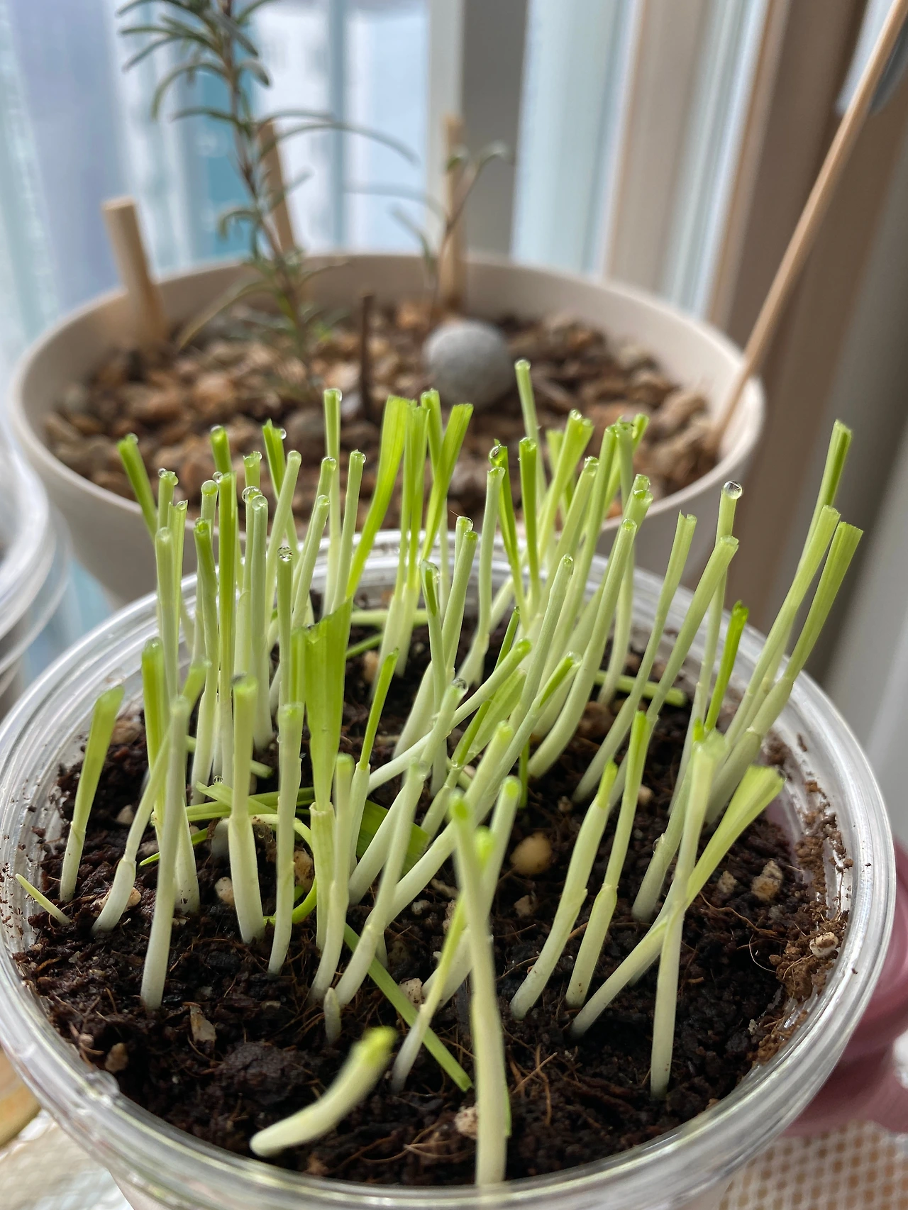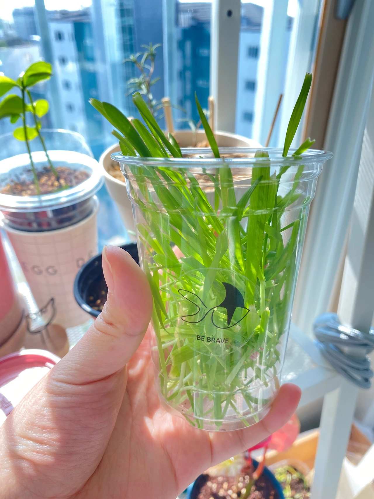 새싹보리는 정말 듣던 대로 쑥쑥 자라서 한 번 절단해 주었는데, 며칠이 지나자 다시 엄청난 속도로 자라나기 시작했다. 기특하긴 한데 좀 무섭기도... 새싹보리는 물을 끌어당기는 성질이 강한 식물이라, 아침이 되면 끝부분에 몽글몽글 이슬이 맺히곤 했다. 이건 좀 귀여웠다.
