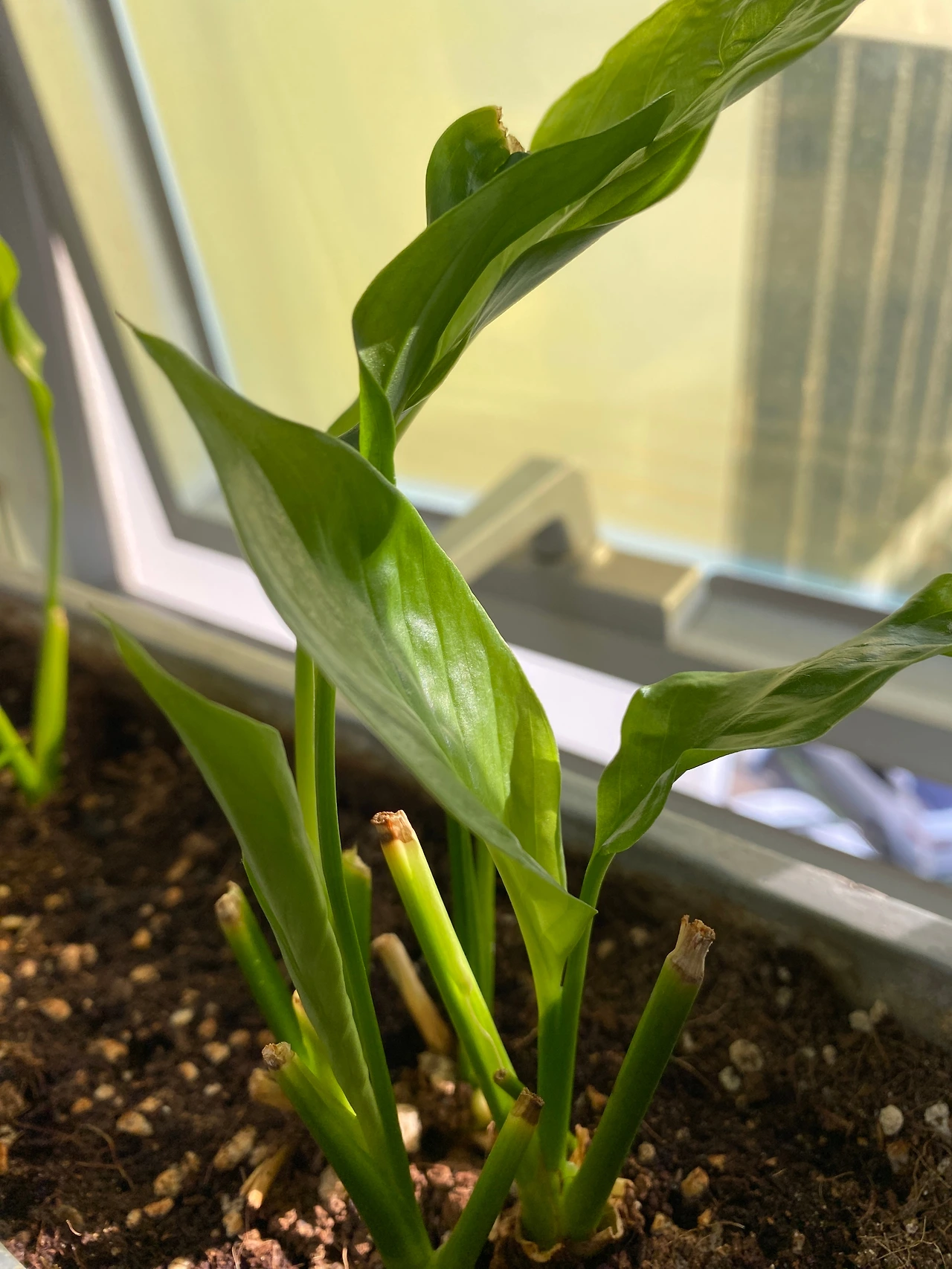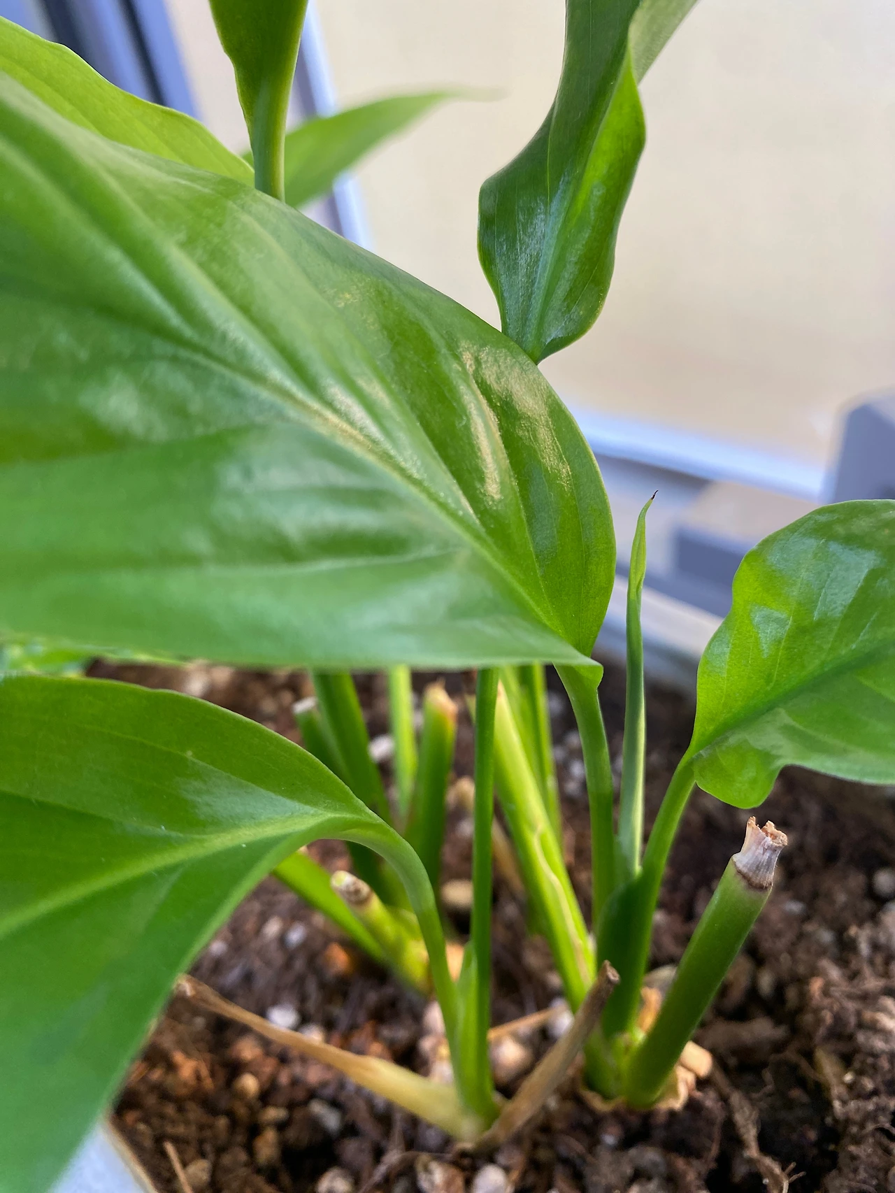 밑동까지 바짝 잘라낸 버킨과 달리 스파티필름은 기존 줄기에서 새 줄기가 나올 수 있게끔 어느 정도 길이를 정해 줄기를 남겨두었다.