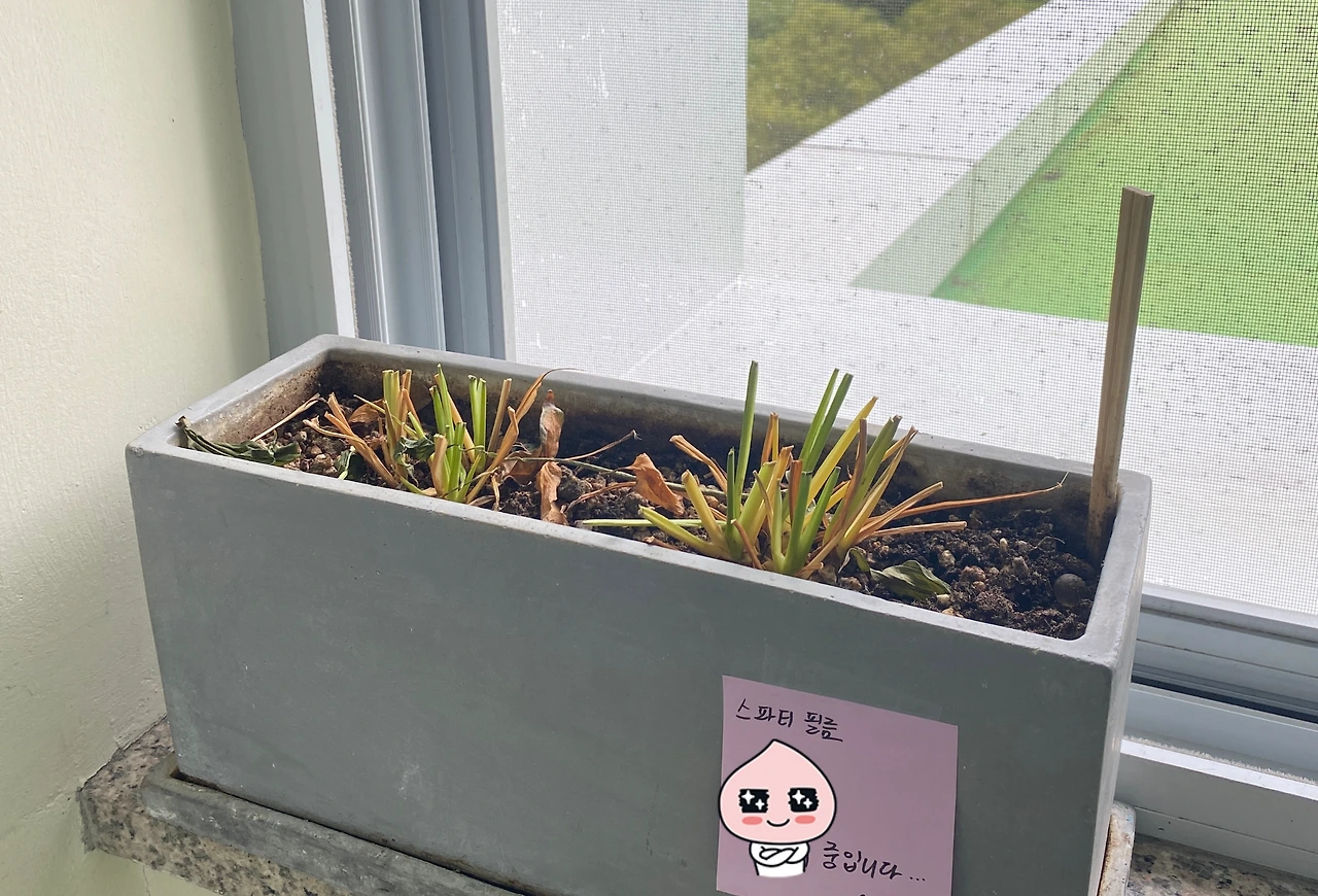 상한 잎을 모두 잘라내고 화분 속 흙을 잘 말리기 위해 식물 의무실 복도 창가에 내놓아 두었다. 문제는 비주얼이 누가 봐도 죽은식물 무더기여서.. 메모를 붙여두었다.