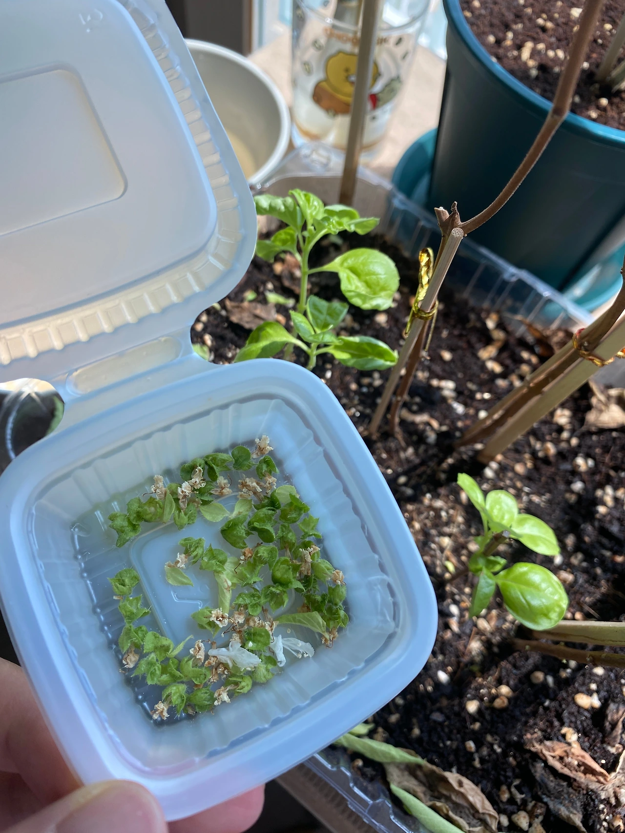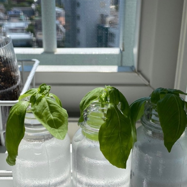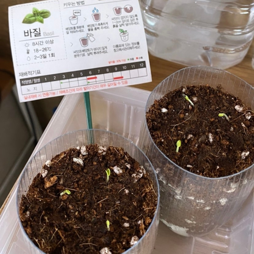 바질은 씨앗부터 키웠다. 탄산수 공병을 잘라 화분 하나에 씨앗 3-4개를 심고 바질 잎이 손 한 마디 크기로 자랄 때까지 사용했다. 투명한 페트병 화분은 육안으로 흙의 과습여부를 빨리 파악할 수 있어 당시 새내기 식물집사였던 내게 큰 도움이 되었다.