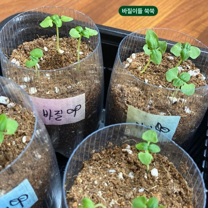 바질은 작은 페트병 안에서도 빠르게 성장해서 금세 더 큰 페트 화분으로 합쳐서 심어야 했다.
