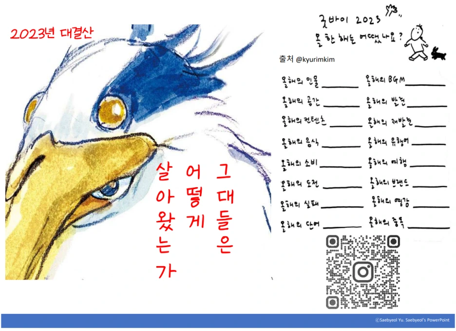 축하할 일보다는 힘겨웠던 순간이 먼저 떠오른 2023 이었다. 그래도 의미를 두고 싶은 건 힘겨운 순간들이 잘 지나갔다는 점이다. 아마 돌이켜보면 모두 자양분이 될 순간들일 것이다. 과거는 원래 시간이 지난 후 재해석으로 다시 창조되는 법이다. 그런 의미에서 내게 2023년은 흔들리지 않을 기반을 다져준 한 해였다. 크고 작은 풍파를 견디게 해주는, 그릇을 넓히는 시간이었다. 2024년에는 더 넓어진 그릇에 어떤 순간들을 담아 갈지 기대와 크고 작은 '목표 설정'을 해보아야겠다.
