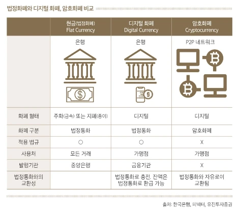 - 네 가지 단어 중 비트코인은 어디에 해당되는 걸까? 그리고 각 단어의 차이는 무엇일까? 매일 기사를 보고 유튜브를 보지만 각 매체마다, 정보를 소개하는 주체마다 사용하는 단어가 달랐다. 영어로 먼저 보자면 'Currency'는 '화폐', 'Virtual'은 '가상의', 'Crypto'는 '비밀의' 이란 뜻을 지닌다. 'Virutual currency'인 가상 화폐는 '실제가 아닌 허상의 것' 이란 측면에서 우리가 흔히 쓰는 돈인 법정 화폐와 다르다. '진짜가 아닌데도 진짜인 것처럼 행세하는 가짜 돈'이란 부정적인 인식을 줄 수 있다. 따라서 최근엔 '가상화폐'보다 '가상자산(Virtual asset)'이란 표현이 더 정확한 표현으로 받아들여지고 있다. 반면 해외에서는 가상화폐가 블록체인을 기반으로 한 암호화 기술을 활용해 만들었다는 점에서 '암호화폐(Cryptocurrency)'로 부르는 것이 일반화되어있다. 따라서 따지고 보면 가상화폐, 가상자산, 암호화폐. 모두 아직 적합한 명칭을 찾지 못해 혼재되어 쓰이고 있는 단어였다. 하지만 '디지털 화폐(Digital currency)'는 이와 다르다. 법정화폐로서의 가치를 지니며 국가에서 통제하게 된다.
